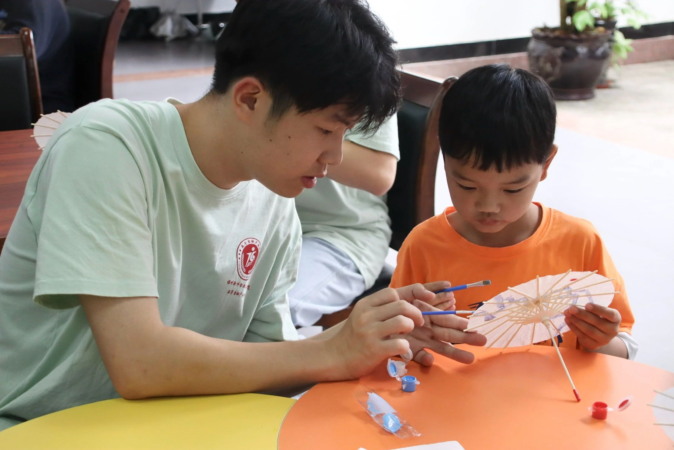 在彩绘油纸伞环节,小朋友们开始亲手绘制属于自己的油纸伞。他们充分发挥创意,一笔一画,勾勒出了心中的模样,灵动的双手游走于伞面和颜料之间,一朵朵精致的莲花悄然绽放,一条条灵动的鱼儿跃然伞面,风格各异,有的古典文雅,有的清新可爱。此外,为追求“更高、更快、更强”的奥运精神,小朋友们用汗水和激情彩绘出奥运五环,为运动健儿们加油助威,满载爱国之情。