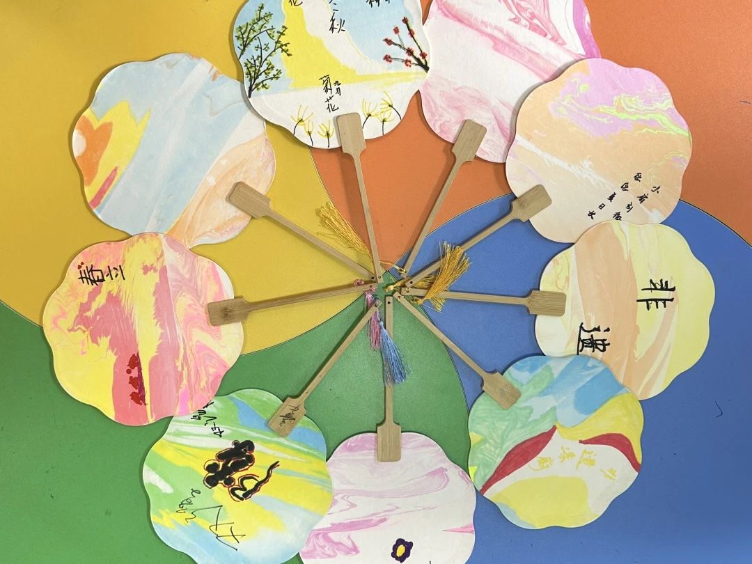 漆扇以扇子为载体,运用大漆工艺制作而成的艺术品,在水面绘出图案效果,晕染在扇子表面,形成自然天成的轮廓。在实践队员的协助下,小朋友们挥洒着童真与想象,将心中的奇思妙想化作一幅幅独特的漆扇。