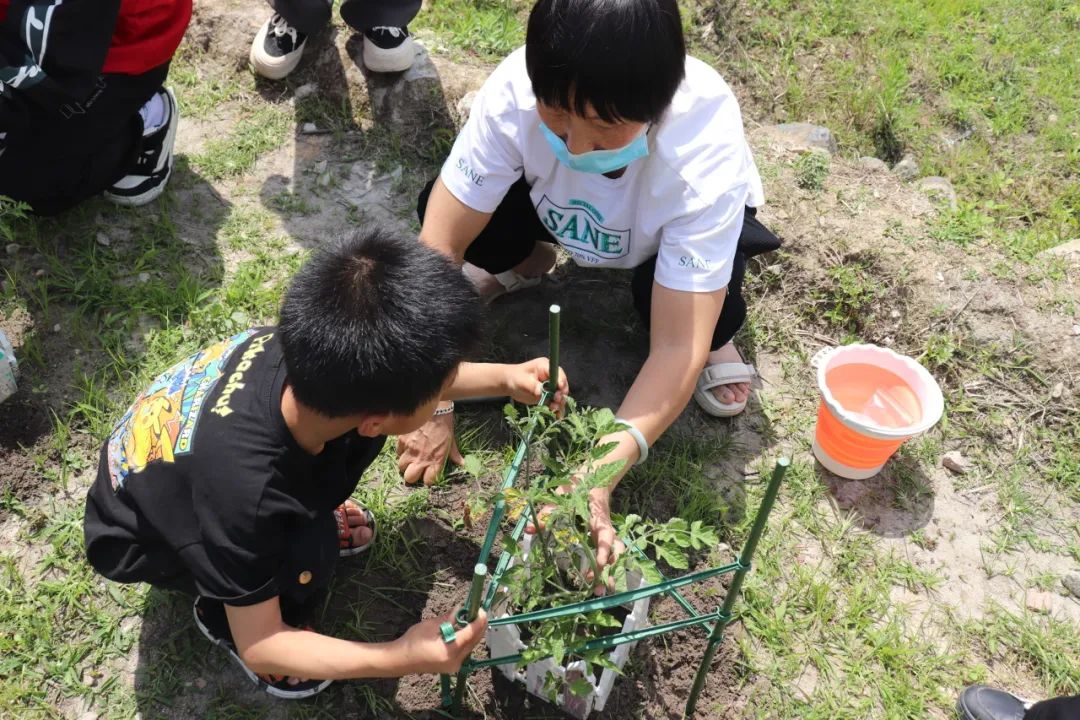 随后,每组家庭都顺利找到了自己在上一次活动中种植下的小番茄苗,惊喜地发现上面已然开花结果了。看到这一幕,小朋友们都为自己的劳动成果而由衷地感到开心!而今天大家来到这里的任务,也就是为这些番茄苗进行松土、施肥、浇水以及搭架。小朋友们在家长和入党积极分子的齐心协力的帮助下,没多久就高效地完成了所有任务。小朋友们满心欢喜,他们觉得通过自己的努力让小番茄苗茁壮成长特别有成就感,也感受到了劳动的快乐和意义。入党积极分子们则深感欣慰,能和小朋友们一起见证这些成长瞬间很有价值,在帮助小朋友的过程中也收获了满满的温暖和满足,更加体会到了付出的美好。