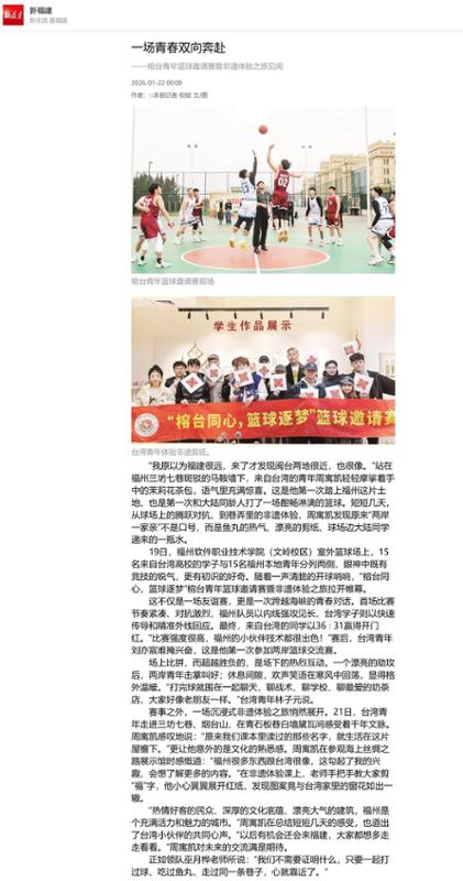 近日,“榕台同心,篮球逐梦”榕台青年篮球邀请赛暨非遗体验之旅在福州软件职业技术学院顺利举办。活动吸引了台湾中部高校15名学子与皇冠即时比分_皇冠篮球投注-体育*直播:学子同场竞技,以篮球为媒搭建青春对话平台。此次活动受到两岸多家媒体广泛关注,纷纷聚焦报道,全方位展现了这场以体育为纽带、文化为桥梁的榕台青年交流盛景,生动诠释了“两岸一家亲”的深厚情谊,有效深化了两岸青年的情感联结与文化认同。