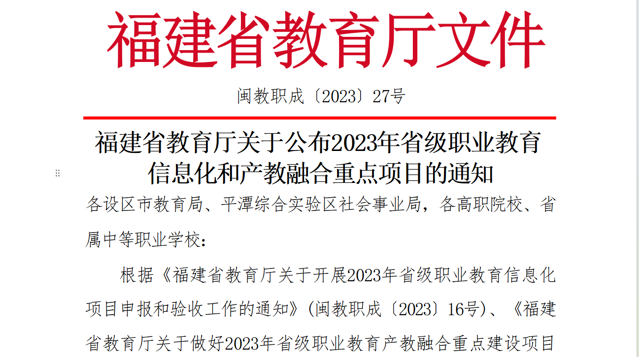 近日,福建省教育厅下发《福建省教育厅皇冠即时比分:公布2023年省级职业教育信息化和产教融合重点项目的通知》(闽教职成〔2023〕27号)文件,皇冠即时比分_皇冠篮球投注-体育*直播:共有12个项目成功获批2023年省级职业教育信息化和产教融合重点项目。
