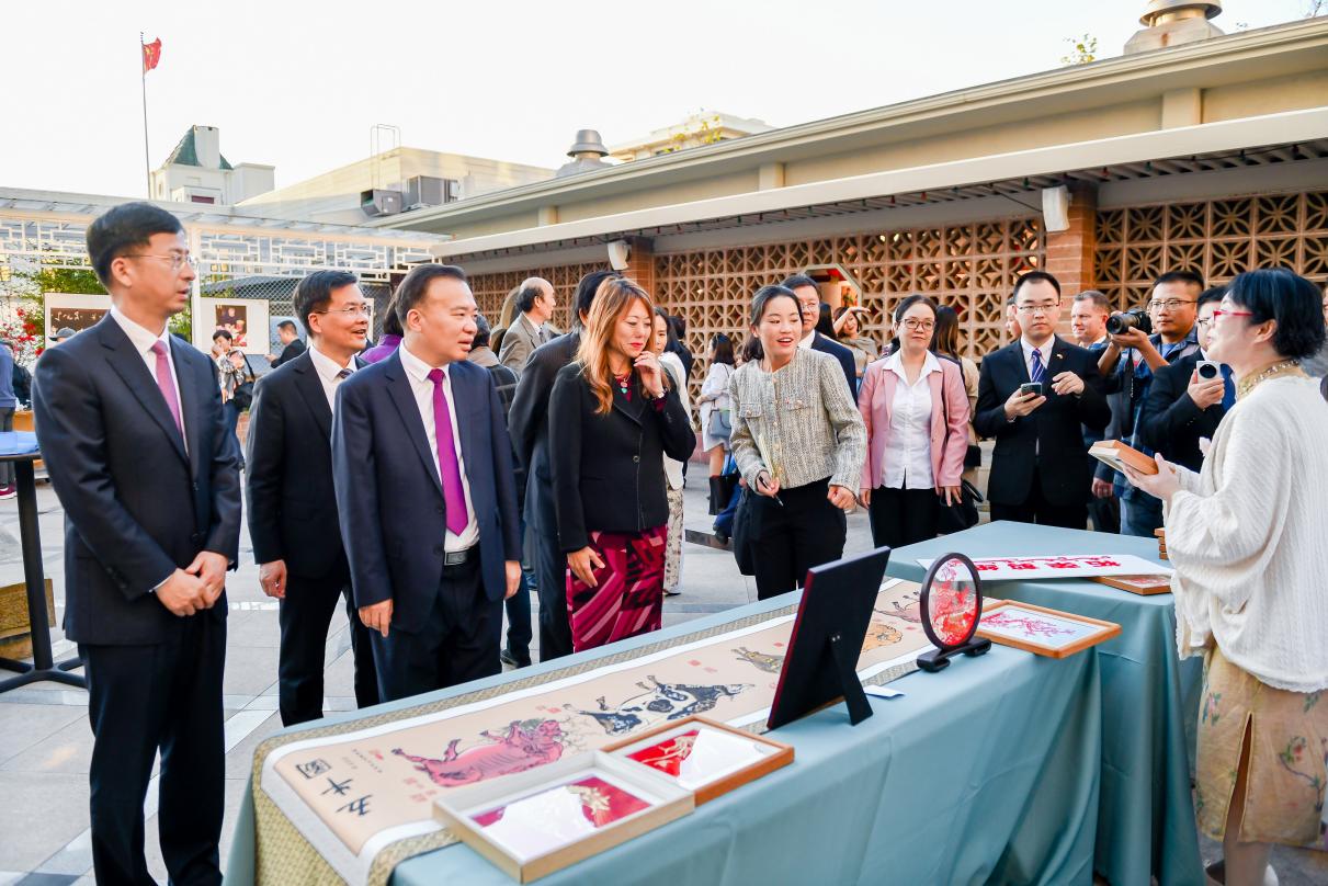 福建省文化和旅游厅厅长陈向东等现场观看剪纸艺术。