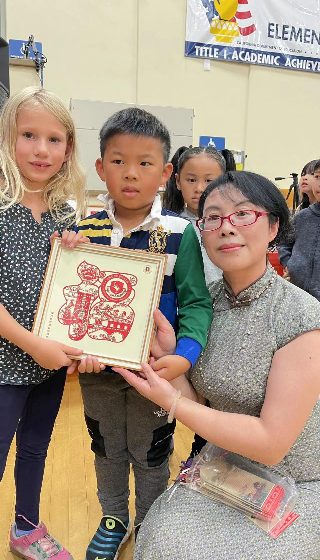 在美国旧金山明星小学一一乌约亚小学(Ulloa Elementary Schoo)现场教授剪纸,