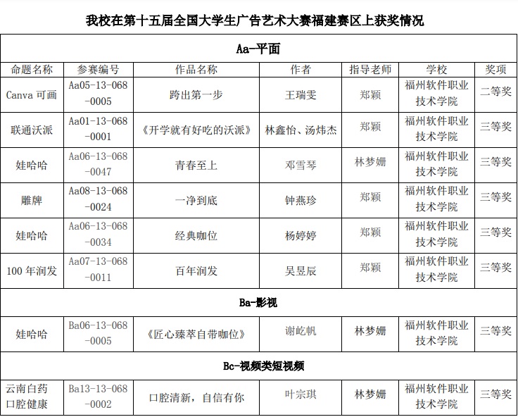 第15届全国大学生广告艺术大赛福建赛区评选结果今日揭晓,皇冠即时比分_皇冠篮球投注-体育*直播:学子作品共获二等奖1项,三等奖7项。