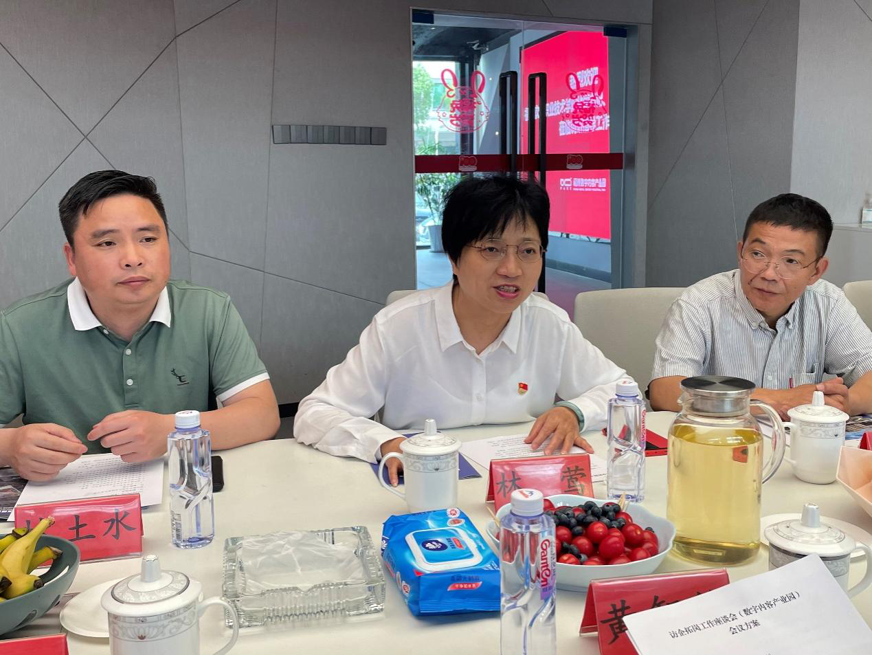 会后,林莺书记、俞发仁校长一行参观走访了福州聚印象影视传媒有限公司、福州木鸡郎智能科技有限公司、福州柒零三文化传媒有限公司的研发中心、展厅和生产车间等。