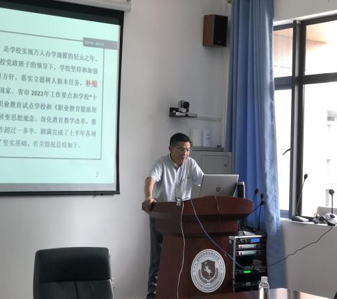 俞校长在会上指出,学校在十四五事业发展的关键之年,实现万人办学规模的纪元之年,坚持“补短板、稳规模、抓内涵、促发展”,做好常态化下的疫情防控工作,在党的建设、治校能力、提质培优、教学工作评价与改进、师资队伍建设、学生服务管理、招生就业工作和和谐校园建设等方面取得了新的进步,圆满完成了上半年工作任务,实现了时间过半,完成工作任务超过一半,为高质量地完成年度要务清单奠定了坚实基础。