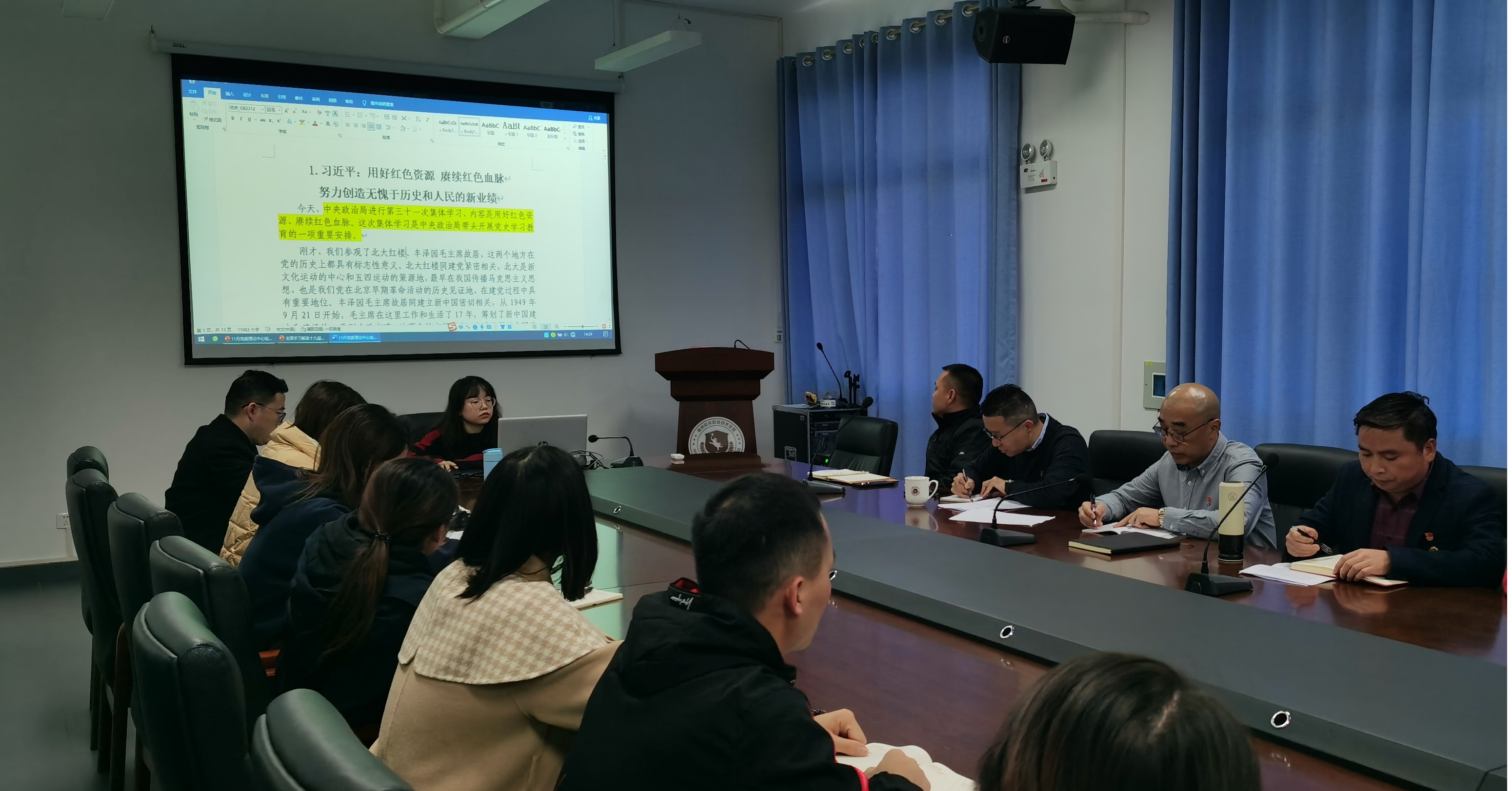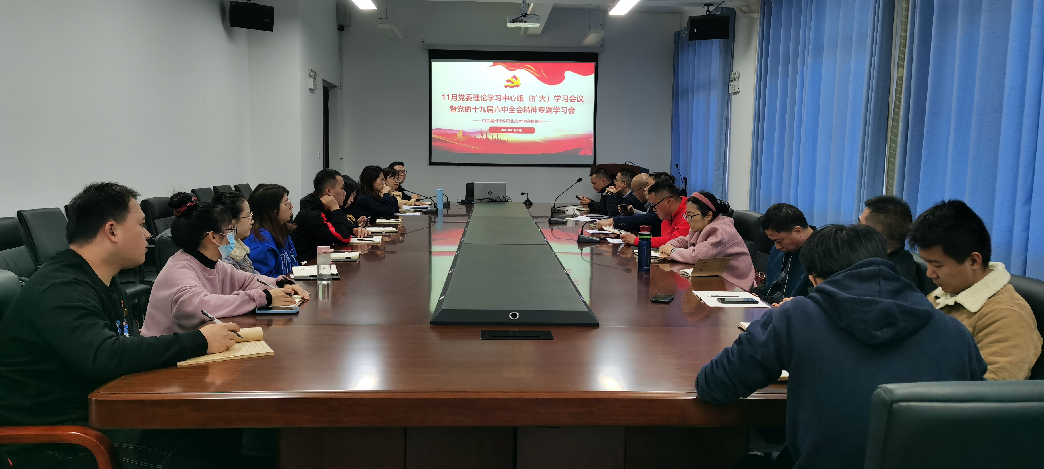 2021年11月24日下午,皇冠即时比分_皇冠篮球投注-体育*直播:召开11月份党委理论学习中心组(扩大)学习会议暨党的十九届六中全会精神专题学习会,学校党政领导班子、党委委员、各党总支负责人、各党支部书记、马克思主义学院负责人、团委书记、党委工作部(党委宣传部)成员等35人参加本次学习会,会议由学校党委书记王卫旗主持。