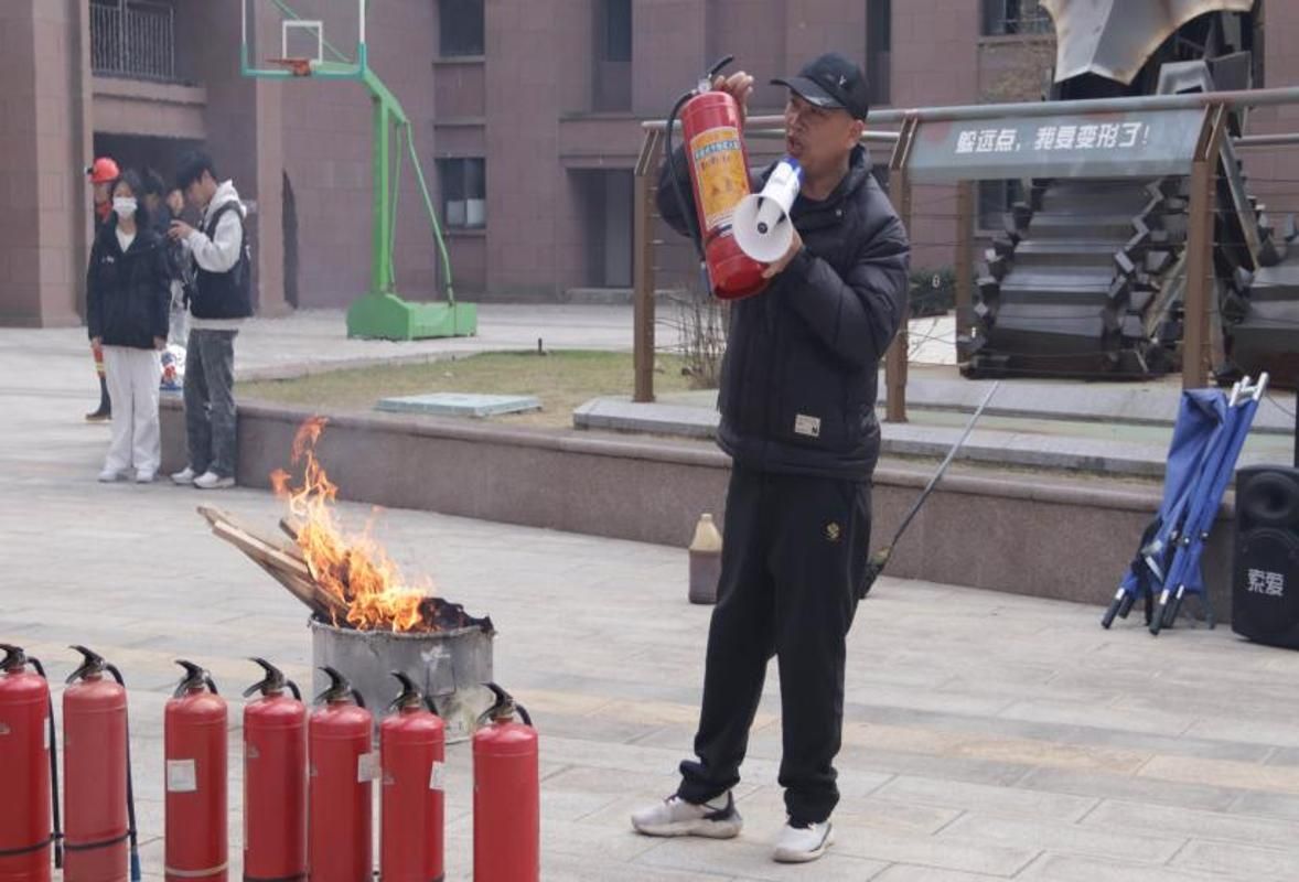 最后,进行灭火器使用实操演练环节。消防专员现场讲解并演示了干粉灭火器的使用方法,重点强调了“提、拔、握、压”四字口诀为核心。随后,在场学生分组进行灭火实操,亲身体验了灭火器的使用技巧,掌握了基本技能。