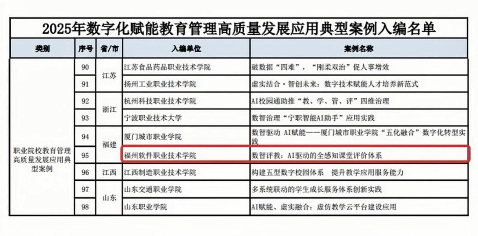 近日,《中国教育信息化》杂志社公布《2025年数字化赋能教育管理高质量发展应用典型案例》入编名单,皇冠即时比分_皇冠篮球投注-体育*直播:撰写的《数智评教:AI驱动的全感知课堂评价体系》成功入选,成为福建省仅有的两所入选职业院校之一。