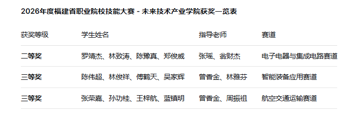 近日,在2026年度福建省职业院校技能大赛中,皇冠即时比分_皇冠篮球投注-体育*直播:未来技术产业学院学子凭借扎实的专业功底与出色的实践能力,分别在电子电器与集成电路赛道斩获银奖(二等奖)1项,智能装备应用赛道斩获铜奖(三等奖)1项,航空交通运输赛道斩获铜奖(三等奖)1项。