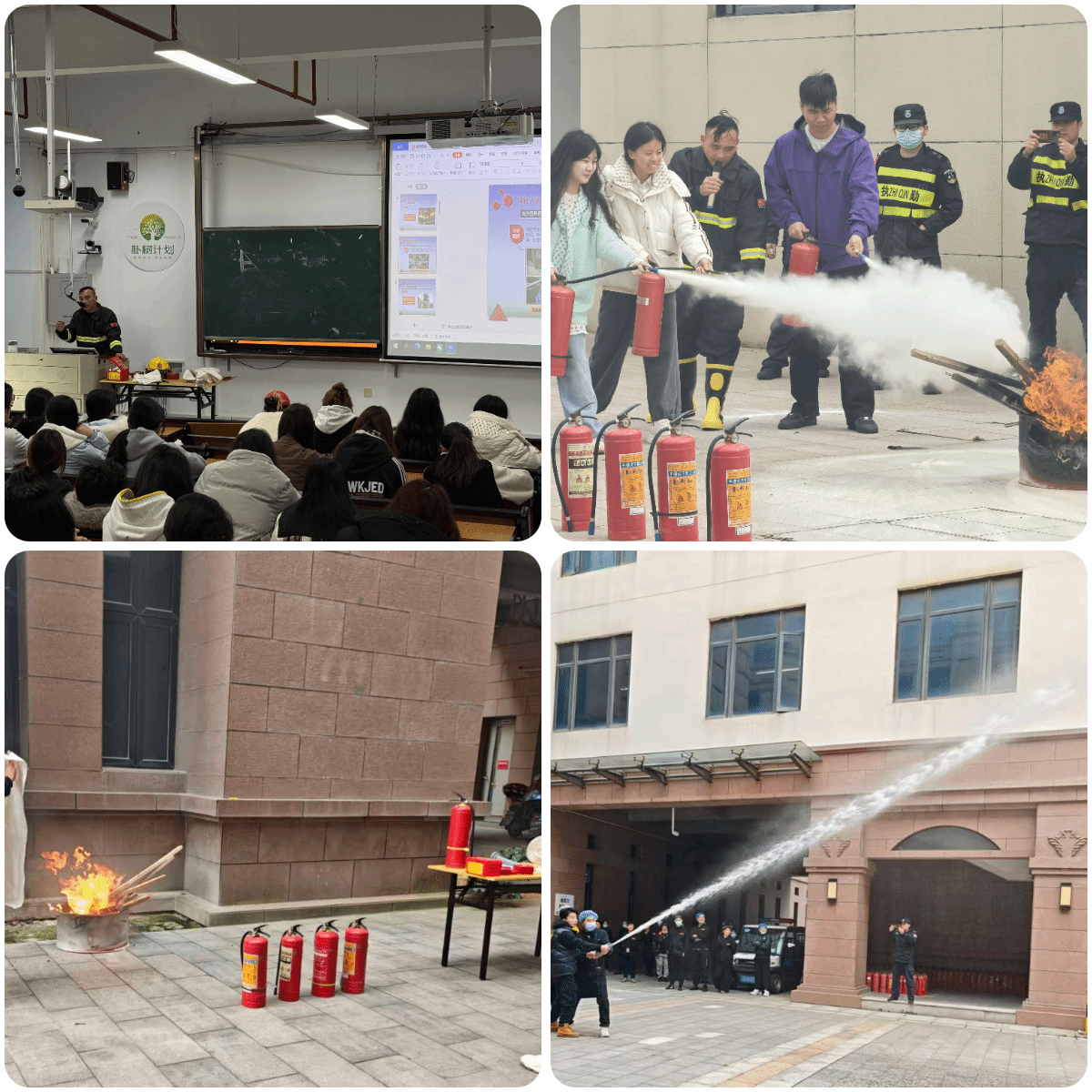 同时,为全面提升师生及职工的消防知识掌握与实操能力,我们分层次开展全体师生与食堂商户的消防演练,联合物业中心组织各学院师生,通过模拟火情讲解消防知识、实操灭火器材,帮助掌握疏散避险技能;针对食堂重点区域,联合后勤与资产保障处开展专项消防演练,系统讲解消防设施使用规范,组织对灭火器、水带、水枪等消防器材进行实操,进一步强化从业人员应急处置能力,筑牢校园消防防线。
