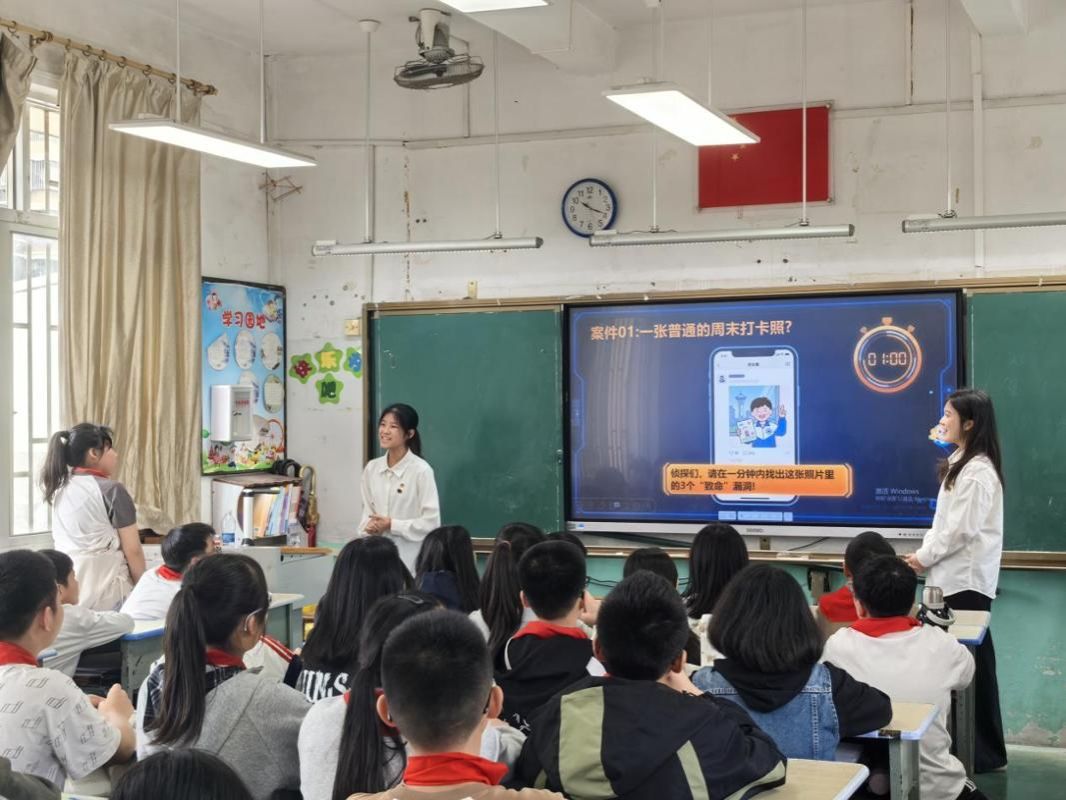 其中,两个贴近小学生生活的案例引发了热烈反响。在“一张普通的周末打卡照”环节,学生们在一分钟内找出了照片中暴露校名校徽、窗外可见建筑、高清原图泄露指纹等“致命”漏洞,深刻认识到“无心之举,可能成为敌人的‘拼图’”。在“免费Wi-Fi陷阱”环节,宣讲人通过“免费领取稀有皮肤”的情境模拟,提醒同学们警惕公共不明网络、不点陌生链接,防止个人信息被窃取。