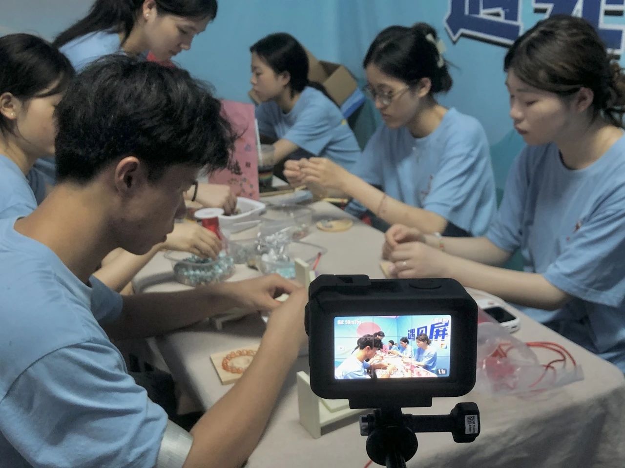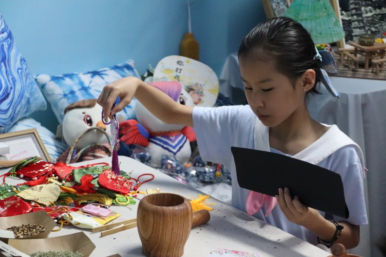 在工作人员的指导下,实践队员化身“非遗传承人”,充当每个非遗展位的志愿者,为广大群众介绍非遗并手把手指导参与非遗体验。在漆扇展位上,队员正在为素白扇面注入绚丽色彩;植物染展区,蓝靛染料在棉布上晕开古朴纹样;串珠手链,一珠一线间,一条精美的手串精美呈现。队员李小阅在体验后感叹:“亲手做的时候才懂,一珠一线都是耐下心来的功夫,这和学习多像啊——只有得沉住气琢磨细节,才能做出像样的成果,这正是我们该向老手艺学的专注与坚持。”