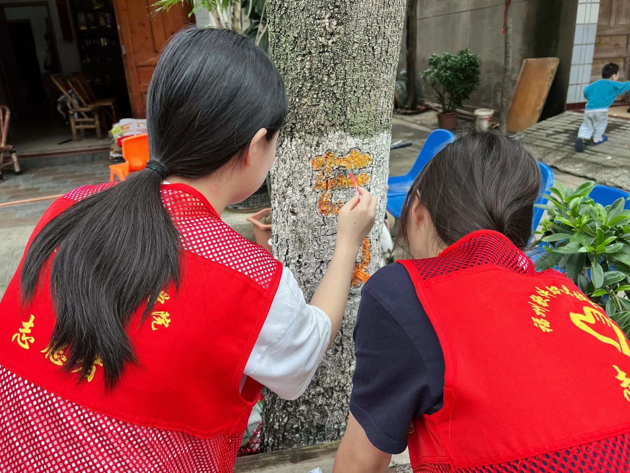 执青春之笔,染一抹活力黄,描绘出文化振兴的激情原色。小组组员挥舞着手中的画笔,在树上勾勒线条,填充明艳的颜色,美丽的彩绘作品在树上跃然呈现,既美化了村容村貌,更是将艺术融入了乡村生活,引领着当地村民对美好生活的向往与追求。