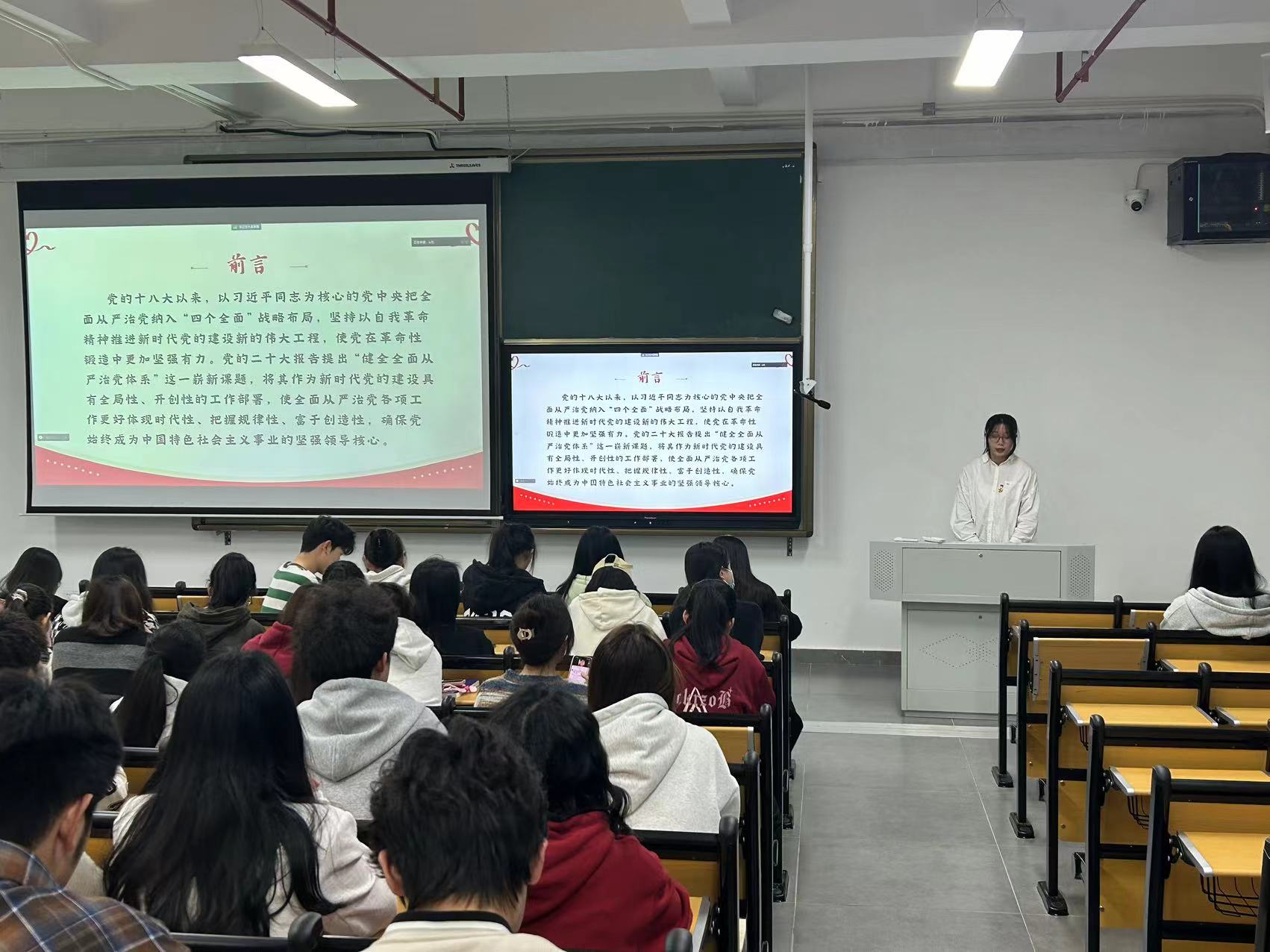 接着,王晖同志向各位同学阐述了全面从严治党体系作为中国共产党的系统性、整体性制度的重要性,它遵循马克思主义建设规律,旨在进一步强化党的领导力和执政能力。身为学生党员和入党积极分子应提升自我修养,严守政治纪律,将个人理想融入服务人民,共同维护党的纪律和权威。