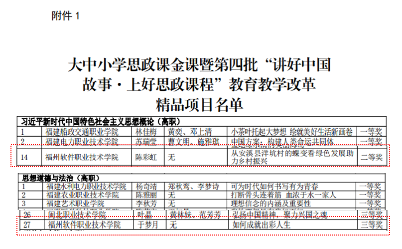 陈彩虹老师报送的《从安溪县洋坑村的蝶变看绿色发展助力乡村振兴》荣获《毛泽东思想和中国特色社会主义理论体系概论》(高职)思政课金课二等奖,于梦月老师报送的《如何成就出彩人生》荣获《思想道德与法治》(高职)思政课金课三等奖。同时,两项成果获批为福建省教育工委第四批“讲好中国故事·上好思政课程”教育教学改革精品项目。