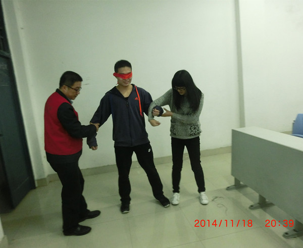 活动于20141118日晚18:30于教学楼B110教室开始,橄榄树志愿者团队负责人风叔(林向荣老师)先为同学们介绍了导盲知识的重要性,希望借此机会能让大家进一步了解盲人朋友的工作学习和生活,与他们建立深厚的友谊。并在现场向同学们演示如何用带盲人朋友外出以及运用大脑空间想象进行定位,像亲密的家人一样,与同学们分享生活中的点滴辛苦与不易。