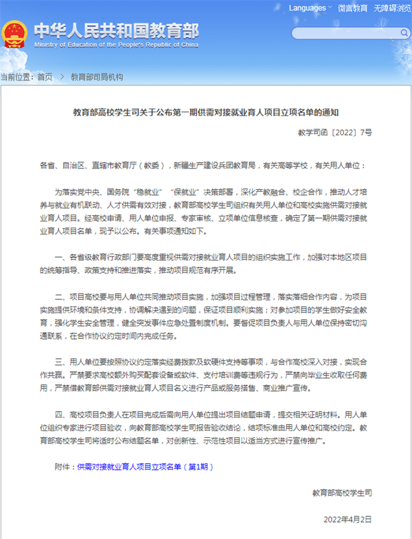 此项目也是教育部今年首次实施供需对接就业育人项目,旨在为推动就业与培养有机联动、人才供需有效对接,帮助用人单位培养和招聘皇冠篮球投注实用型、复合型和紧缺型人才,促进高校毕业生更加充分更高质量就业为目的展开。
