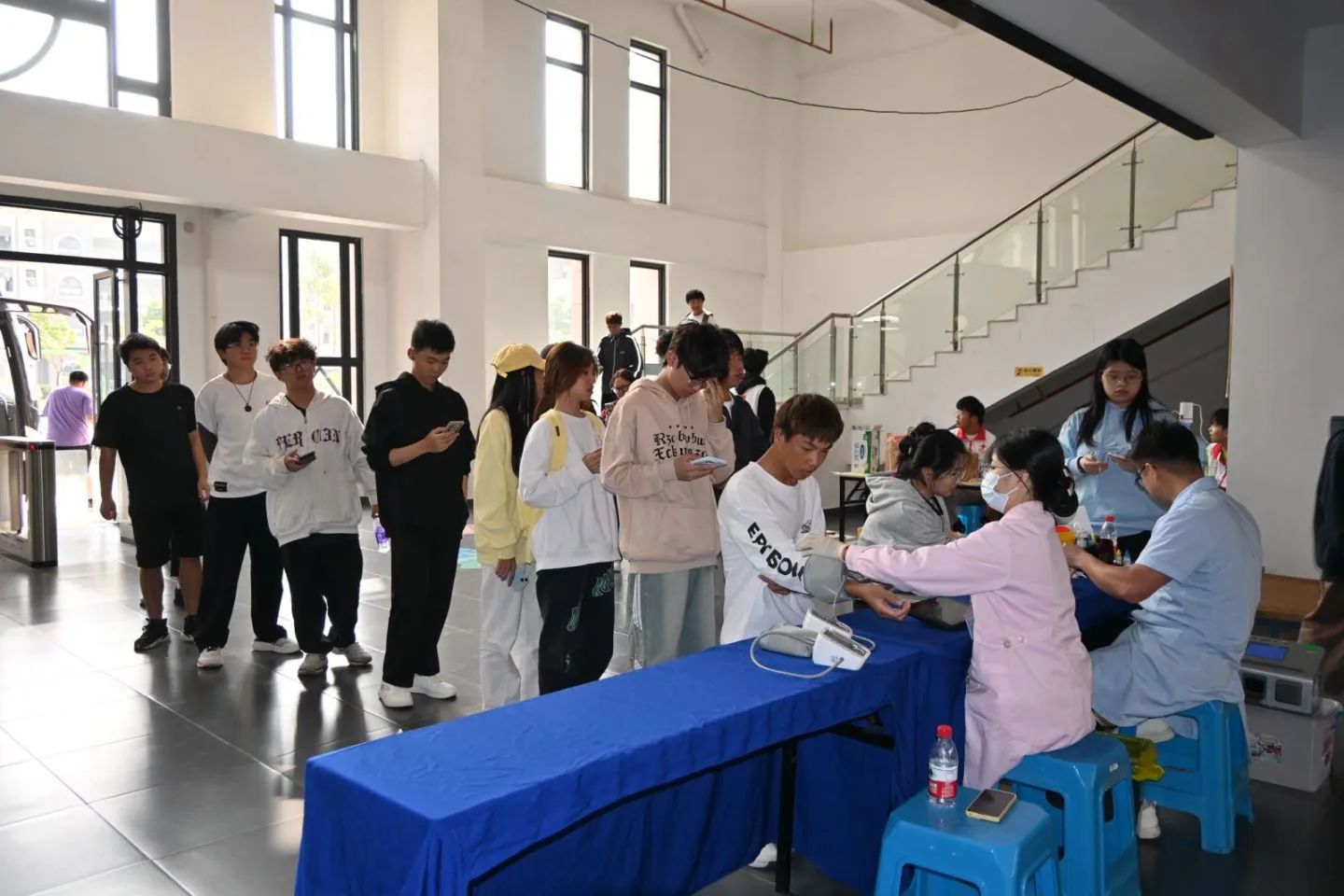 本次无偿献血活动场地主要分为咨询登记区、体检区、采血区、休息区四个区。现场秩序井然,在工作人员和志愿者引导下,师生有序完成填写登记表、测血压、抽血化验等检查流程,各环节顺利推进,保障了活动的高效与安全。