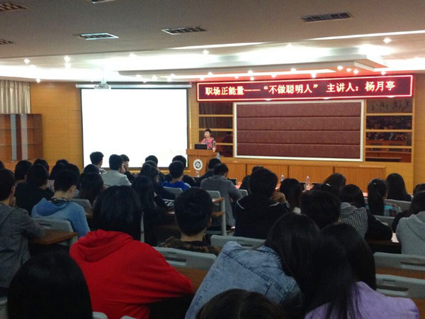 讲座中,杨月亭老师为同学们深入浅出地阐述了如何在职场中“不做聪明人”。现场气氛轻松愉快,杨月亭老师诙谐幽默并极富感染力的语言不时引来场下的阵阵掌声。在现场交流环节中,杨月亭老师根据在场同学的不同专业有针对性地分析了今后的就业趋势,指出了就业方向。