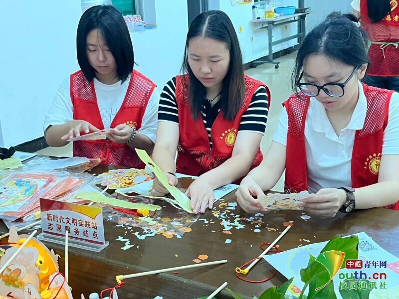 图为社区工作人员与志愿者共同制作花灯。陈小梅 供图