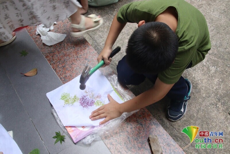 图为小朋友们在认真的敲打自己的拓染作品。 占圣雯 供图
