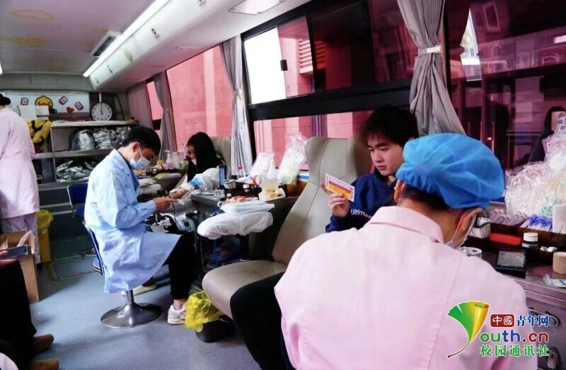 图为达到献血标准的师生于献血车内进行献血。中国青年网通讯员 许玉立 摄