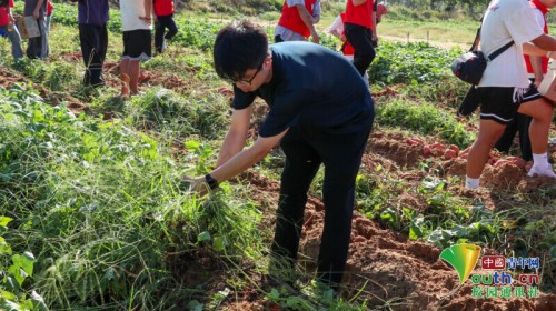 图为团委书记陈晖拔除地瓜里的地瓜叶和杂草。毛雨 供图
