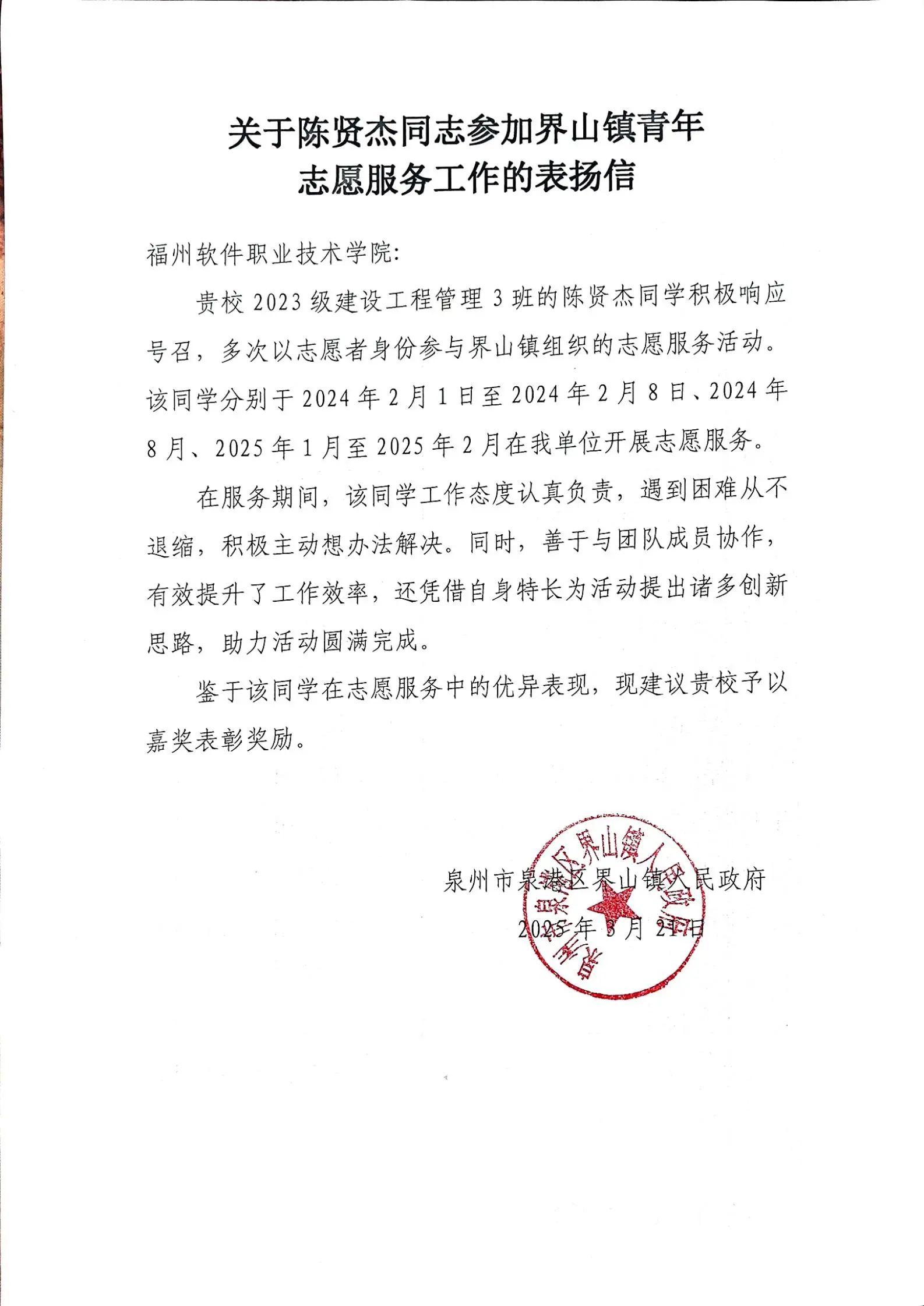 近日,皇冠即时比分_皇冠篮球投注-体育*直播:收到了来自福建省泉州市泉港区界山镇人民政府的发来的感谢信,信中高度赞扬了皇冠即时比分_皇冠篮球投注-体育*直播:智能建造产业学院2023级建设工程管理3班的陈贤杰同学。在寒假期间,陈贤杰同学积极响应号召,分别于2024年2月1日至8日、2024年8月、2025年1月至2月,多次以志愿者身份参与界山镇志愿服务活动。