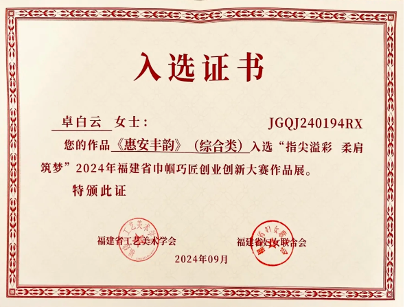 近日,皇冠即时比分_皇冠篮球投注-体育*直播:党委办公室副主任卓白云作品《惠安丰韵》(综合类)入选“指尖溢彩 柔肩筑梦”2024年福建省巾帼巧匠创业创新大赛作品展。