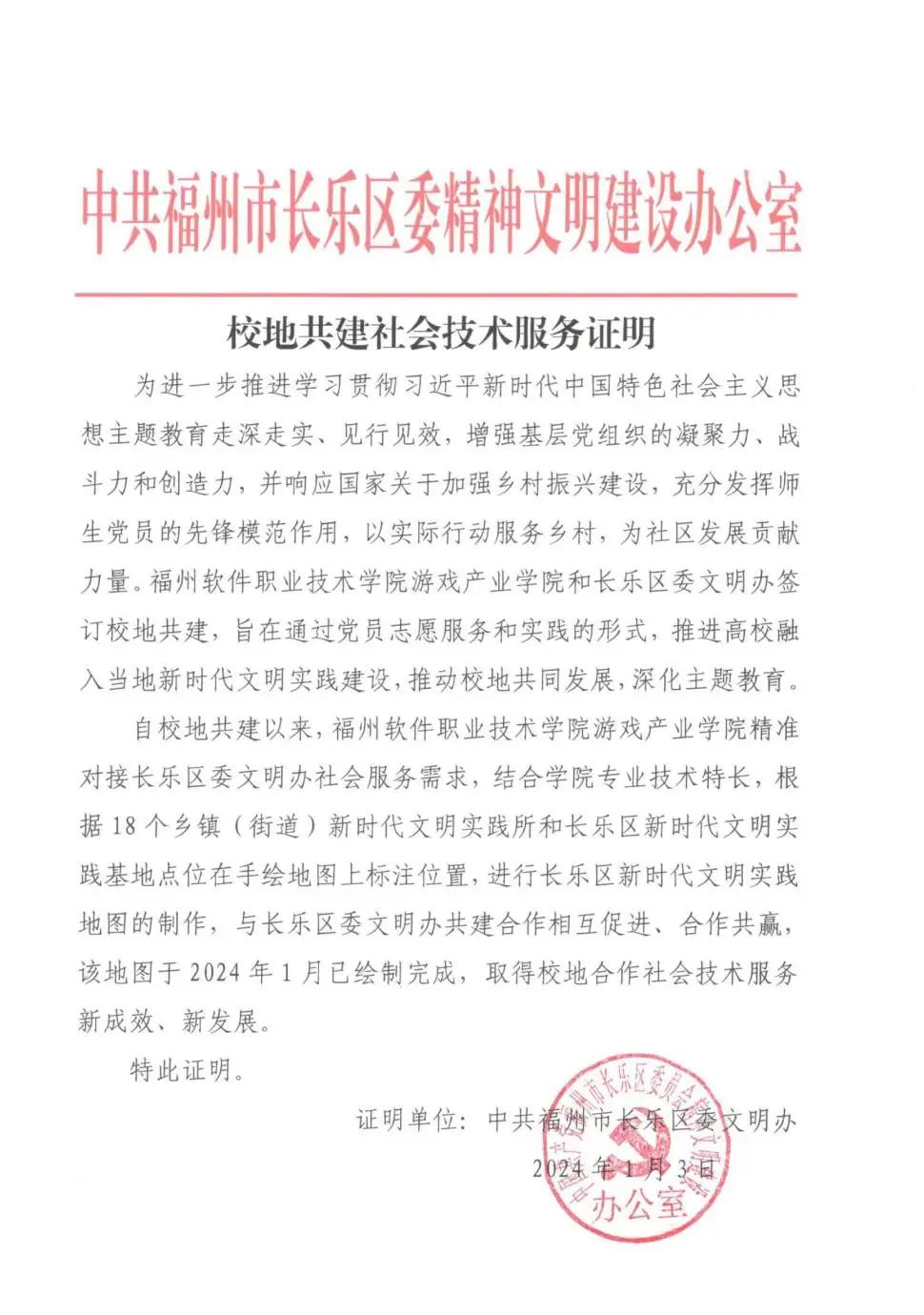福州软件职业技术学院游戏产业学院与长乐区委文明办自校地共建以来,精准对接长乐区委文明办社会服务需求,共建合作相互促进、合作共赢,取得校地合作社会技术服务新成效、新发展。