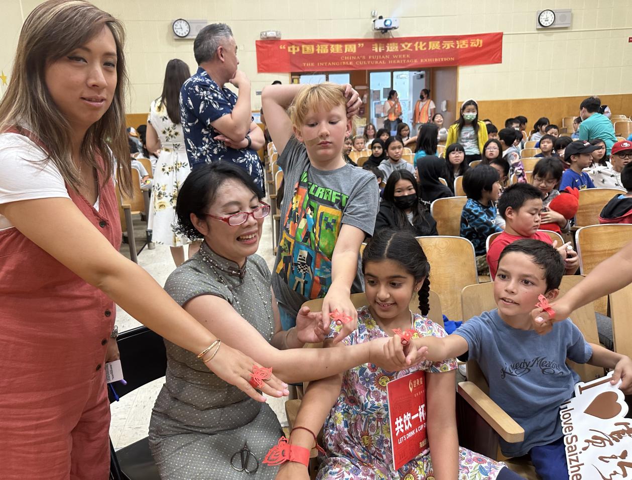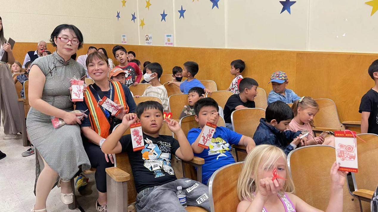 在美国旧金山明星小学一一乌约亚小学(Ulloa Elementary Schoo)现场教授剪纸,
