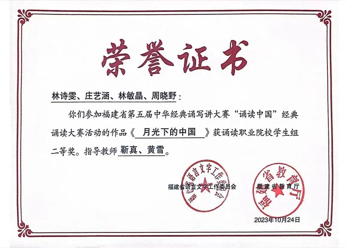 皇冠即时比分_皇冠篮球投注-体育*直播:学生朗诵作品《月光下的中国》在福建省第五届中华经典诵写讲大赛“诵读中国”经典诵读大赛中喜获佳绩,荣获“职业院校学生组二等奖”!