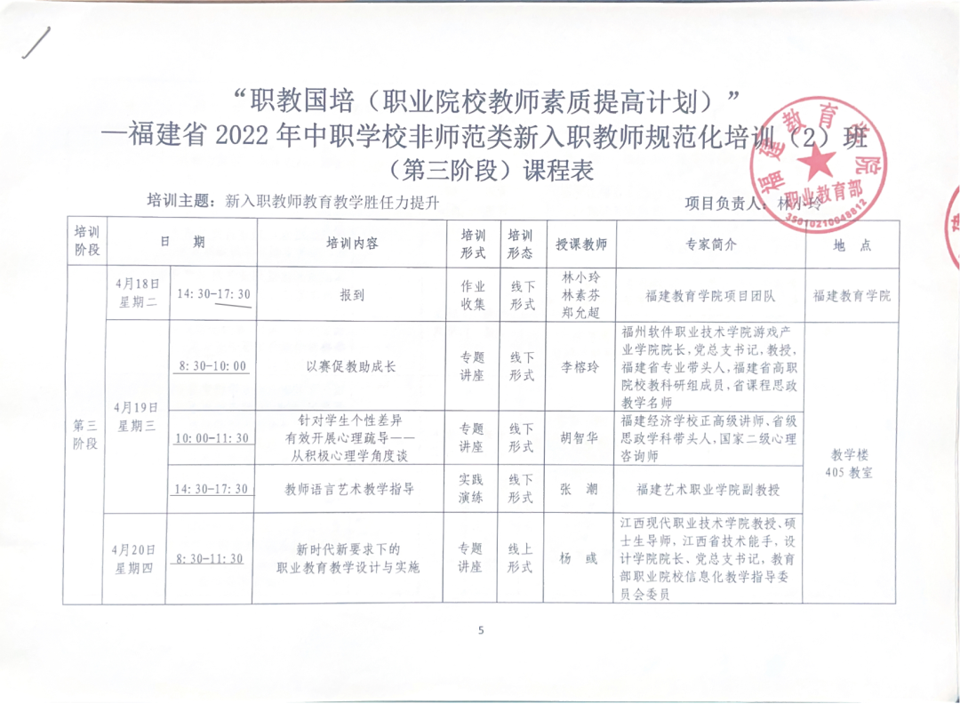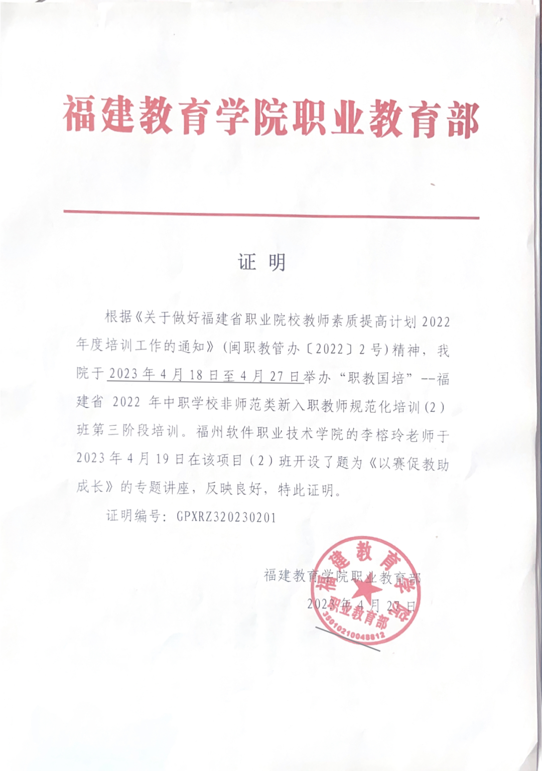 根据《皇冠即时比分:做好福建省职业院校教师素质提高计划2022年度培训工作的通知》(闽职教管办{2022}2号)安排,2023年4月19日,福州软件职业技术学院游戏产业学院院长李榕玲老师受福建教育学院职业教育部邀请,担任“职教国培”——福建省2022年中职学校非师范类新入职教师规范化培训班的授课专家,为来自福建省内的98名中职教师开展了题为《以赛促教助成长》的专题讲座。