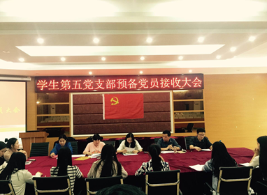 2016年4月21日下午15点,学生第五党支部接收大会于报告厅B113隆重召开。学生第五党支部书记雷翠丽老师、支部组织委员黄红老师及学生党总支书记吴海礁老师、学院党政办公室秘书郑凯源老师出席了本次会议,会议由雷翠丽老师主持,支部学生党员和部分入党积极分子也参加了本次会议。