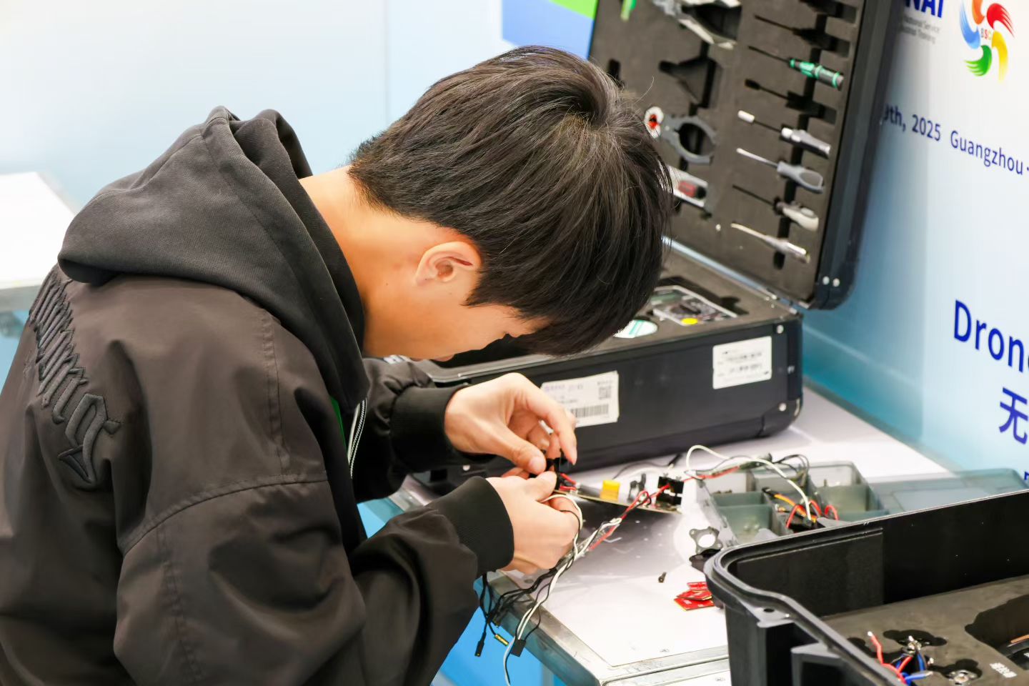 本次华南区域选拔赛以“技能成才、共筑金砖”为主题,设置无人机组装、飞行操控、复杂任务执行及智能开发等多个考核模块,全面检验选手的理论知识、实操能力与团队协作水平。自今年9月启动备赛以来,参赛团队在未来技术产业学院实训基地开展系统训练,围绕无人机精准调试、复杂地形物资投送、数据采集与智能模型优化等环节反复演练,不断夯实技术细节。