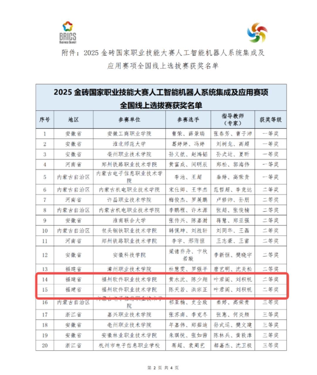 2025年12月2日,2025金砖国家职业技能大赛人工智能机器人系统集成及应用赛项全国线上选拔赛圆满落幕。皇冠即时比分_皇冠篮球投注-体育*直播:未来技术产业学院学子黄水沈、陈少翔、陈天若、洪宗正等凭借扎实的专业功底、精湛的实操技能和默契的团队协作,在众多参赛队伍中脱颖而出,成功斩获二等奖,同时顺利晋级该赛项国际总决赛,为学校赢得了荣誉。