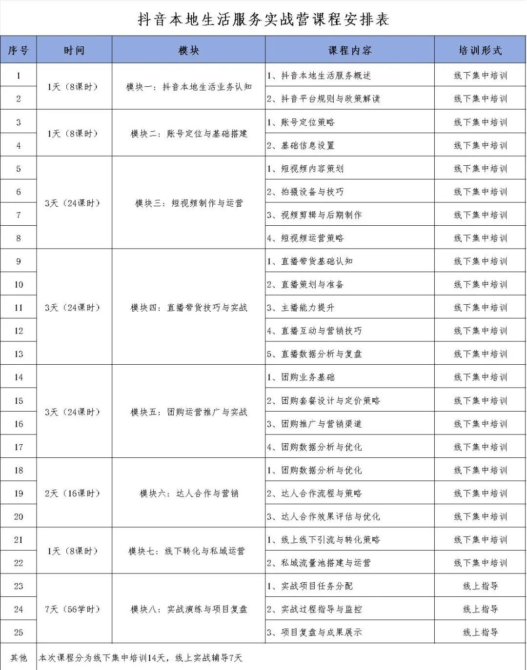 本次实战营课程分7大核心模块+1项实战复盘,14天线下集中培训覆盖业务认知、账号搭建、短视频制作、直播带货、团购运营、达人合作、私域转化全流程,从平台规则、内容策划到数据复盘手把手教学;另有7天线上实战辅导,配套项目任务与成果展示,全方位赋能本地生活服务电商技能!