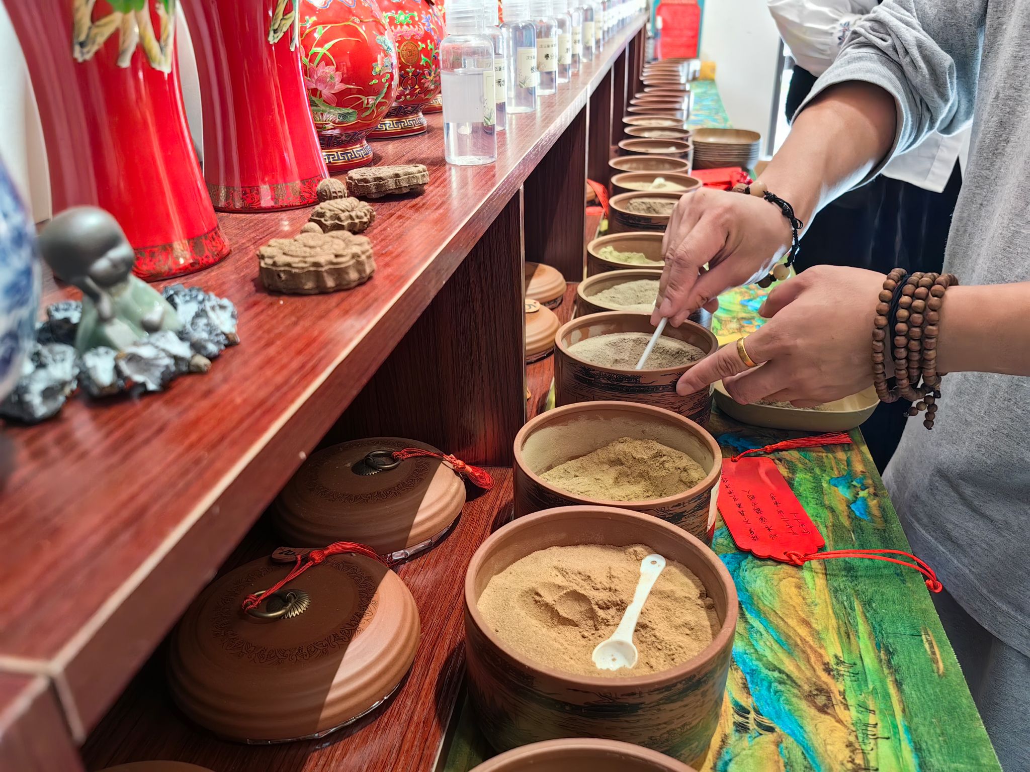 本次体验课以“识香、辨香”为核心,课程中,大家不仅系统学习了木火土金水五行对应的香序文化,还深入了解了各类香品的特性与渊源。老师还带领大家将自制本草香与市面上的成品香进行对比分析,从原料、香气、工艺等维度,让同学们直观体悟传统本草香独特的文化底蕴。