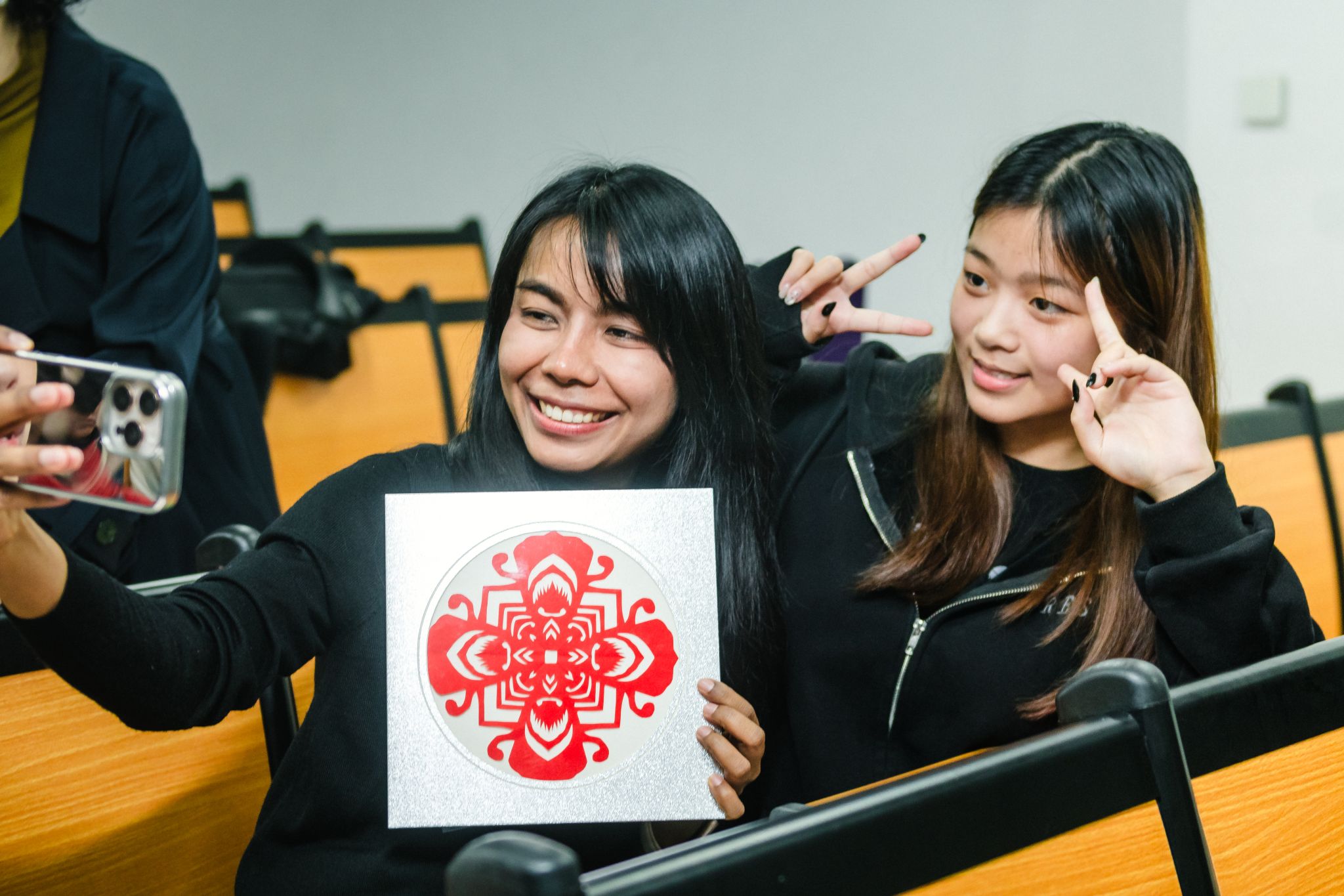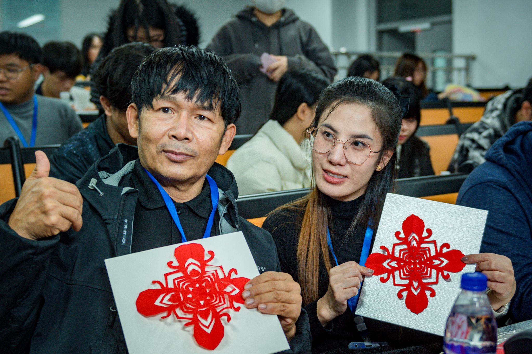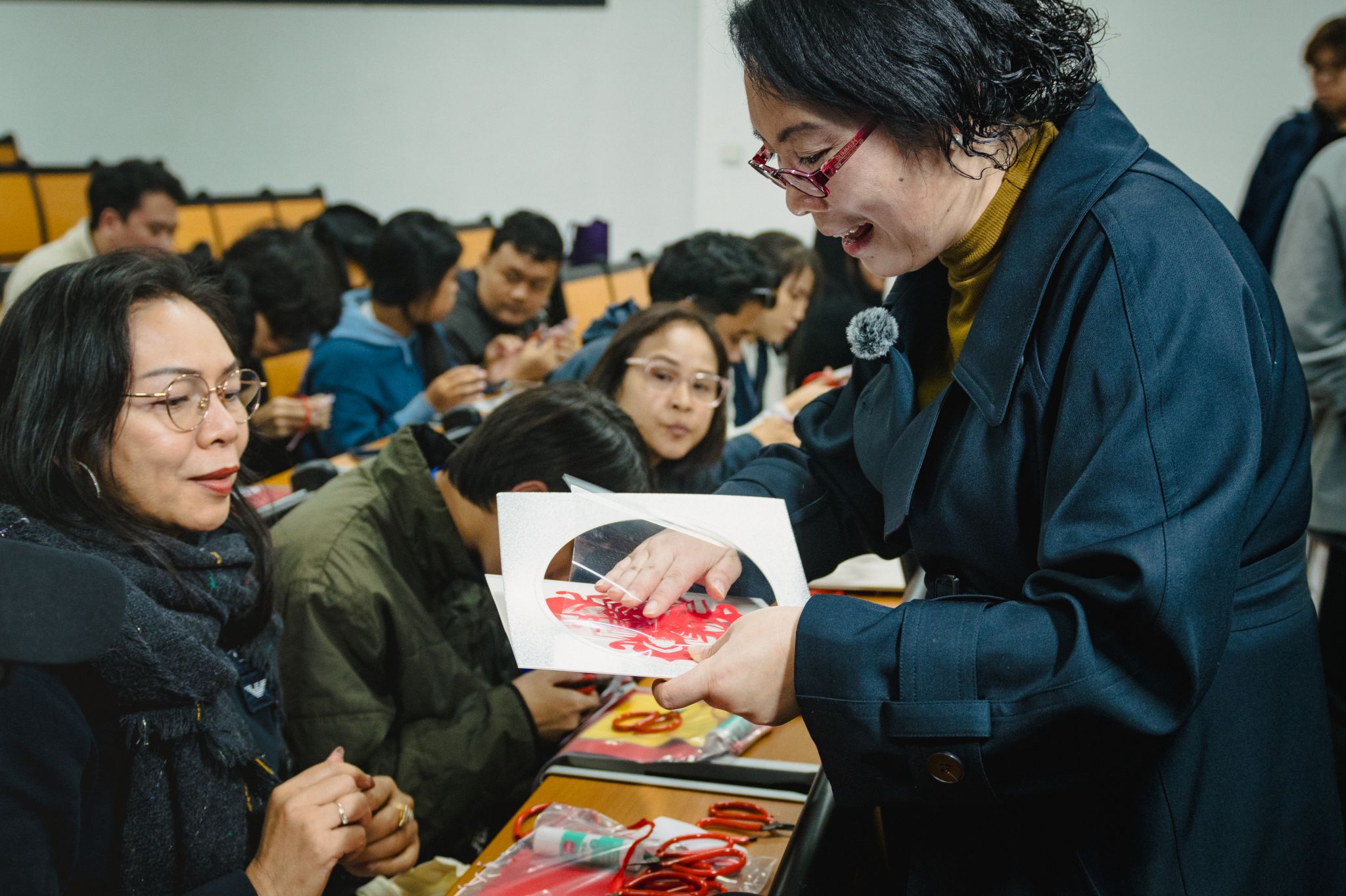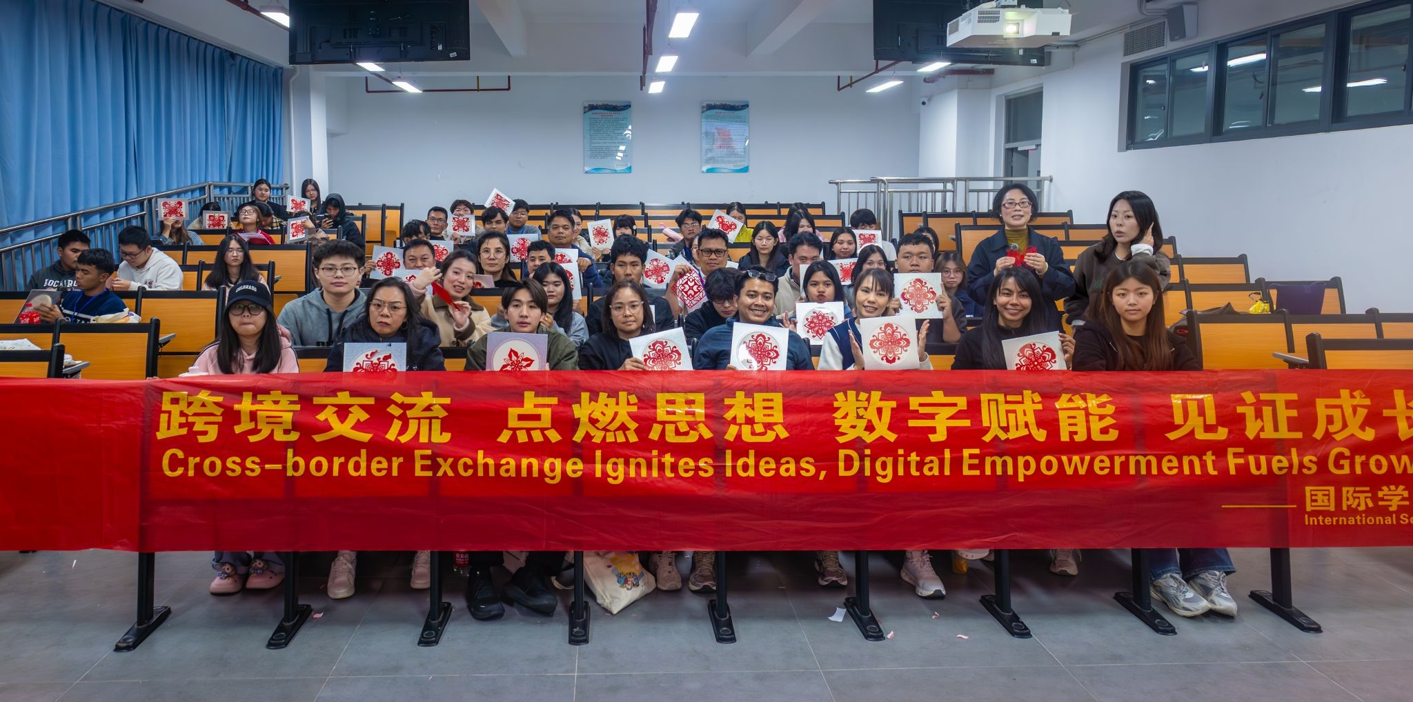 12月24日晚,在福州软件职业技术学院中泰职业技能培训期间,非遗剪纸体验活动顺利开展。38名泰国学员在孔春霞老师的授课下沉浸式感受剪纸魅力,开启跨国非遗文化交流之旅。数字影视传媒产业学院志愿者全程参与,协助开展教学引导等工作,保障活动顺利进行,助力中泰文化交流,让中华非遗文化走近跨国学子。