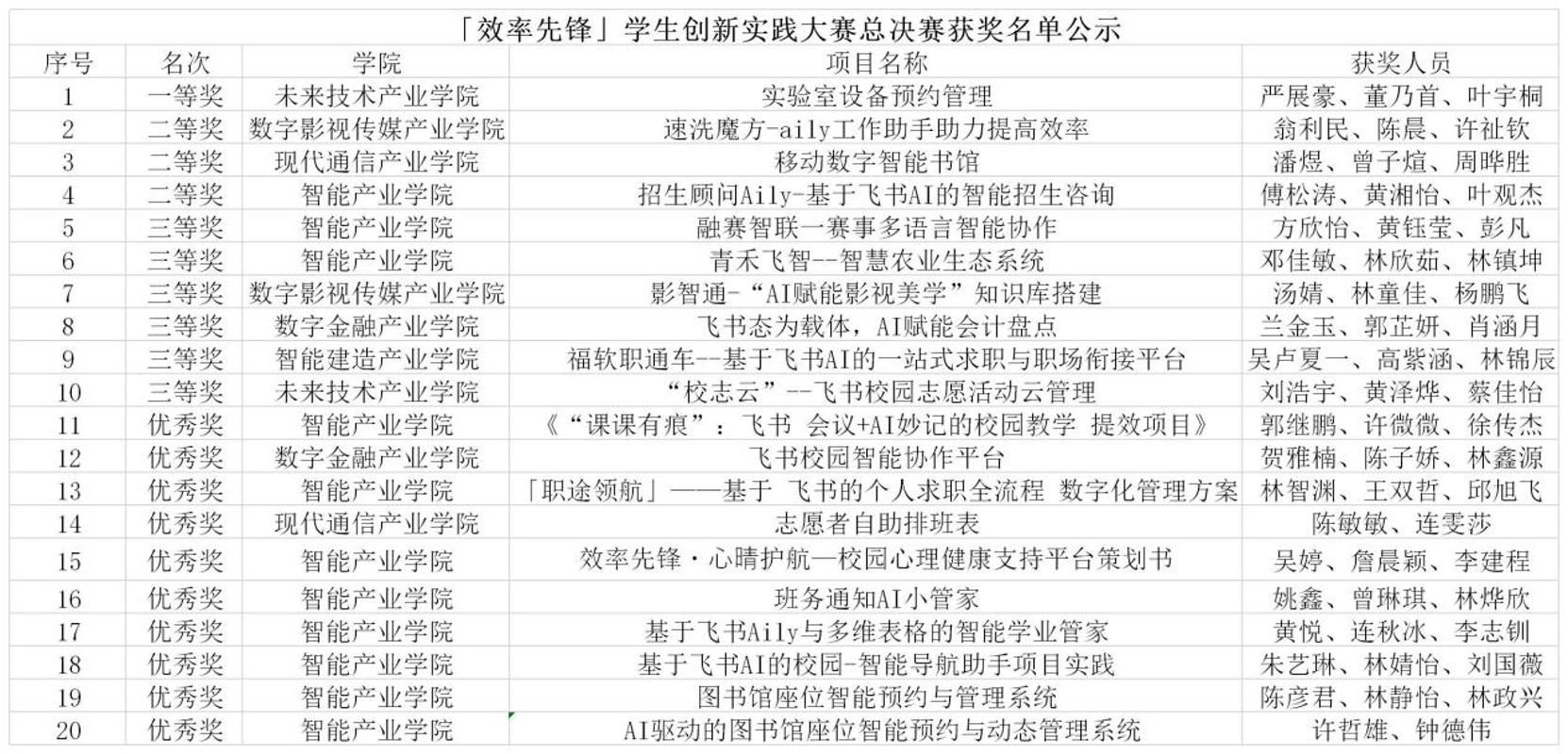 当青春创意碰撞前沿工具,当校园痛点遇见智能方案,一场聚焦效率、创新与协作的巅峰对决圆满收官!12月25日,福州软件职业技术学院教务科研处携手智能产业学院联合飞书团队打造的第一届「效率先锋」学生创新实践大赛决赛圆满落幕。20支优秀团队历经报名组队、专项培训、案例开发与预选赛的层层筛选脱颖而出,以飞书生态为基底,交出了一份份扎根不同场景、兼具实用性与创新性的数字化创新答卷。