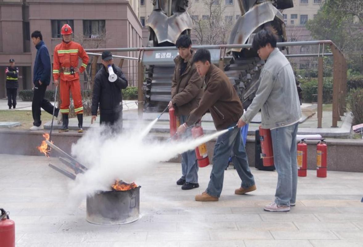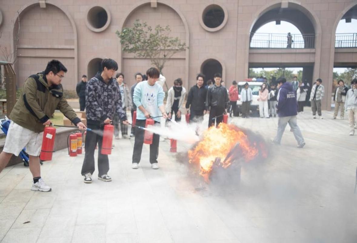 最后,进行灭火器使用实操演练环节。消防专员现场讲解并演示了干粉灭火器的使用方法,重点强调了“提、拔、握、压”四字口诀为核心。随后,在场学生分组进行灭火实操,亲身体验了灭火器的使用技巧,掌握了基本技能。