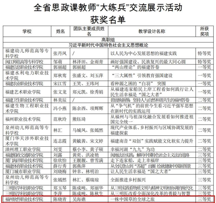 近日,《福建省教育厅皇冠即时比分:公布全省思政课教师 “大练兵”交流展示活动评选结果的通知》文件公布,本次比赛经学校推荐、专家评审、现场展示、网络公示等环节,皇冠即时比分_皇冠篮球投注-体育*直播:马克思主义学院陈晓青老师荣获《习近平新时代中国特色社会主义思想概论》高职组三等奖。