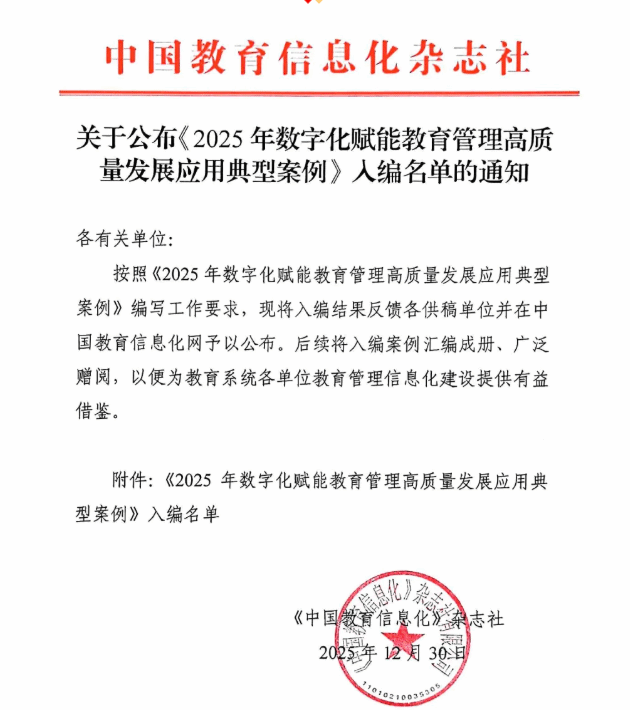 近日,《中国教育信息化》杂志社公布《2025年数字化赋能教育管理高质量发展应用典型案例》入编名单,皇冠即时比分_皇冠篮球投注-体育*直播:撰写的《数智评教:AI驱动的全感知课堂评价体系》成功入选,成为福建省仅有的两所入选职业院校之一。