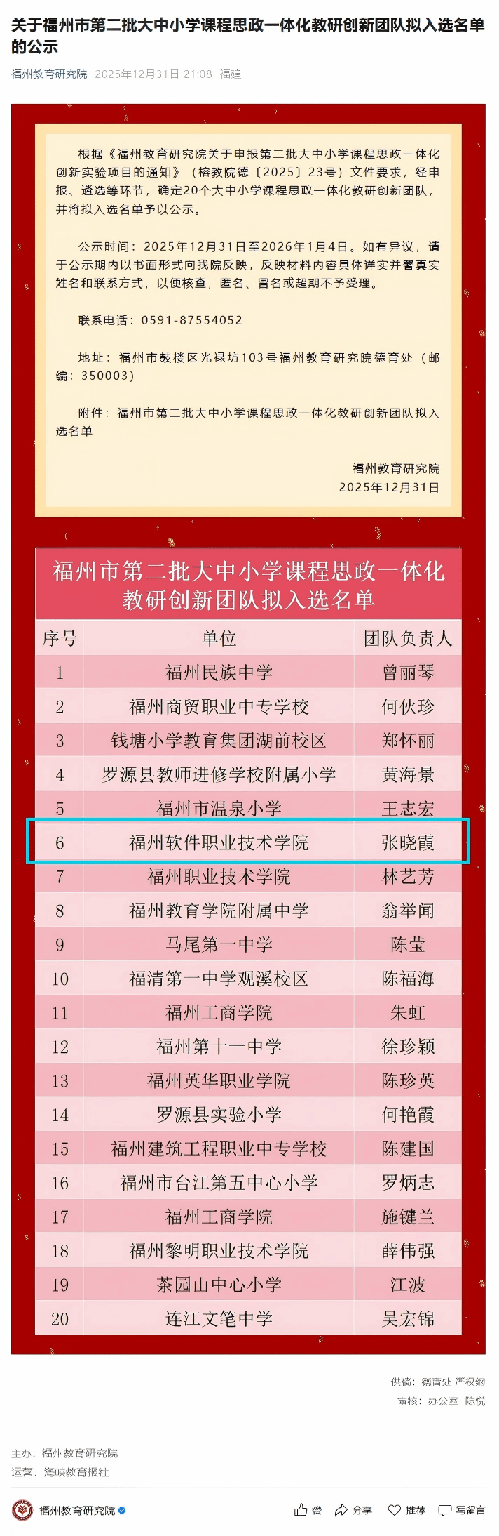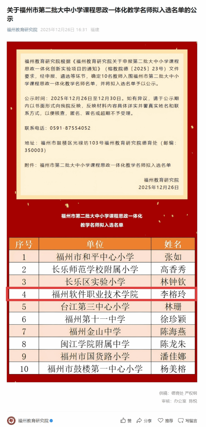 近日,福州教育研究院发布《皇冠即时比分:福州市第二批大中小学课程思政一体化教学名师拟入选名单的公示》与《皇冠即时比分:福州市第二批大中小学课程思政一体化教研创新团队拟入选名单的公示》的通知。经遴选,皇冠即时比分_皇冠篮球投注-体育*直播:校长助理李榕玲拟入选福州市第二批大中小学课程思政一体化教学名师,皇冠即时比分_皇冠篮球投注-体育*直播:教师团队拟入选福州市第二批大中小学课程思政一体化教研创新团队。