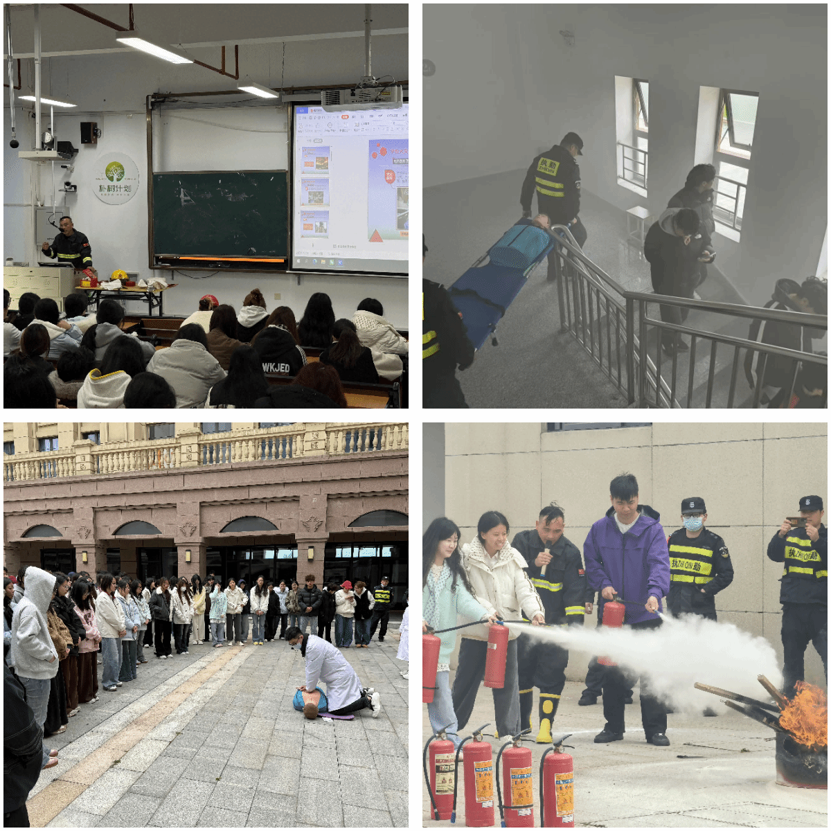 演练还设置了医疗急救教学环节,专业人员现场示范心肺复苏、海姆立克急救法等急救操作,指导师生在紧急情况下如何科学施救、保护伤员。同时,消防专员展示了一些常见的消防设施、器材,讲解了使用方法,组织同学们分组体验使用灭火器对初期火情的灭火扑救演练,切实引导和帮助同学掌握消防安全知识及初期火灾扑救知识,提升抵御应对紧急突发事件的能力。