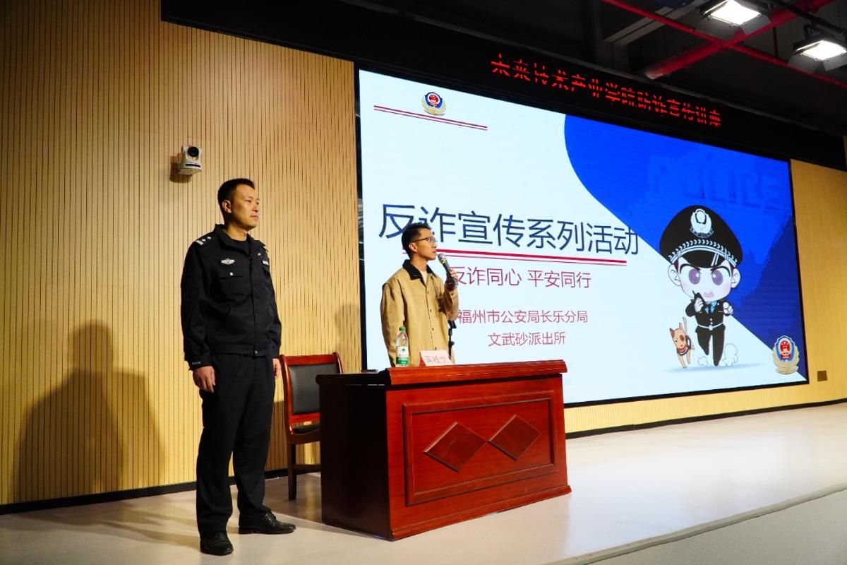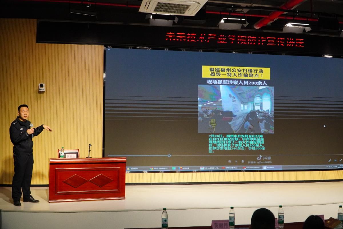 为进一步提升全院师生的反诈骗意识和防范能力,有效遏制电信网络诈骗案件在校园的高发态势,切实保护师生的财产安全与合法权益,营造安全、和谐、清朗的校园环境,皇冠即时比分_皇冠篮球投注-体育*直播:未来技术产业学院特联合福州市长乐区公安局文武砂派出所举办本次反诈骗专题宣讲活动。文武砂派出所副所长蒋桂文,未来技术产业学院党总支副书记柯林逸炜,学生工作部(处)学生管理中心主任卓兴涛,学生工作部(处)综合事务科科长易星辰,辅导员黄丽伟、严钰、黄钰沁、唐烨、陈欣悦、黄为欣,以及各年级各专业学生代表到场参会。