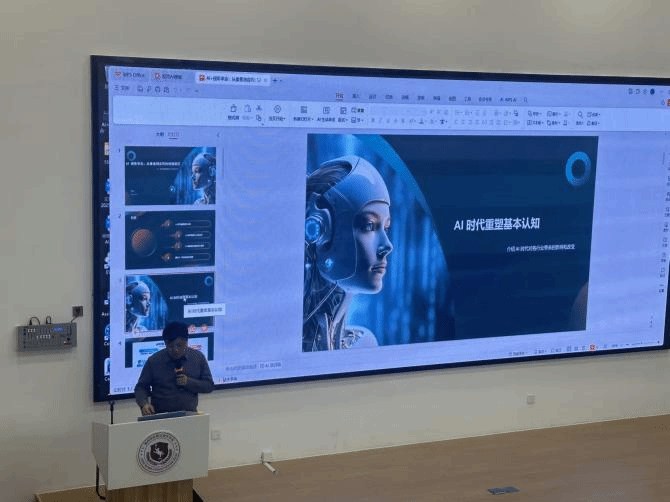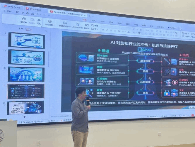在讲座中,罗志宏老师通过一组组数据揭露出AI技术正对就业市场产生显著的双重效应,一方面,重复性、规则性岗位面临替代风险;另一方面,新职业与新岗位呈爆发式增长。罗老师也通过对传统影视创作模式进行分析,结合AI现如今的发展趋势,与同学们分享现在影视各个岗位正被AI驱动的多线程、短周期可视化模式取代,实现“从线性低效到并行智能的高速迭代飞跃”。
