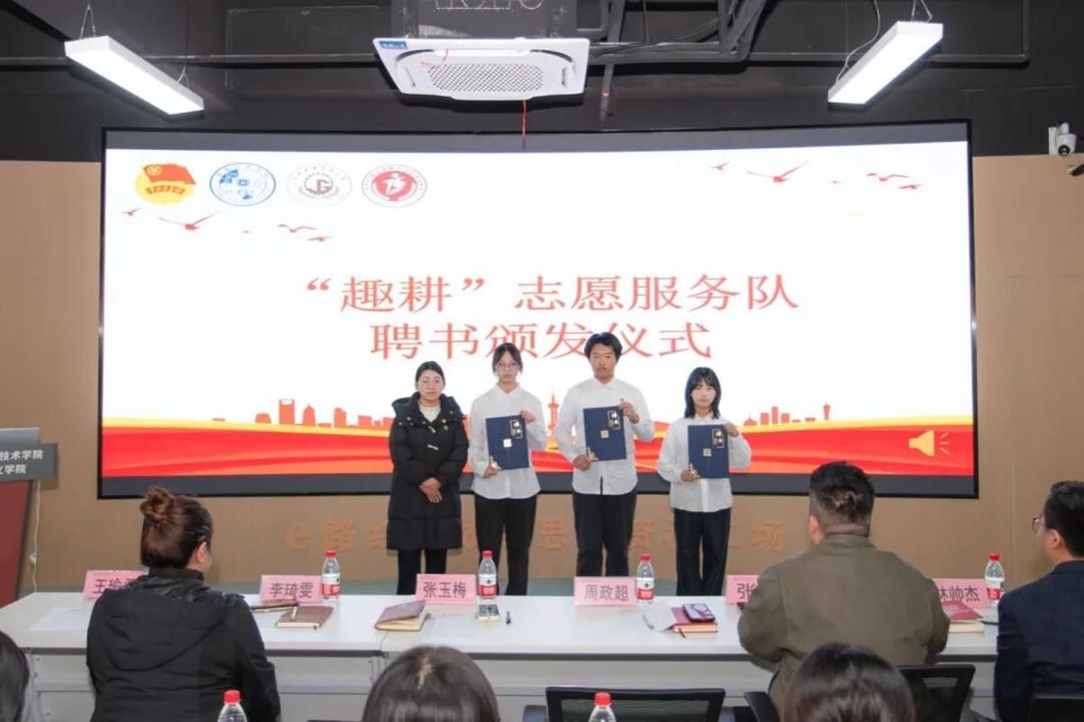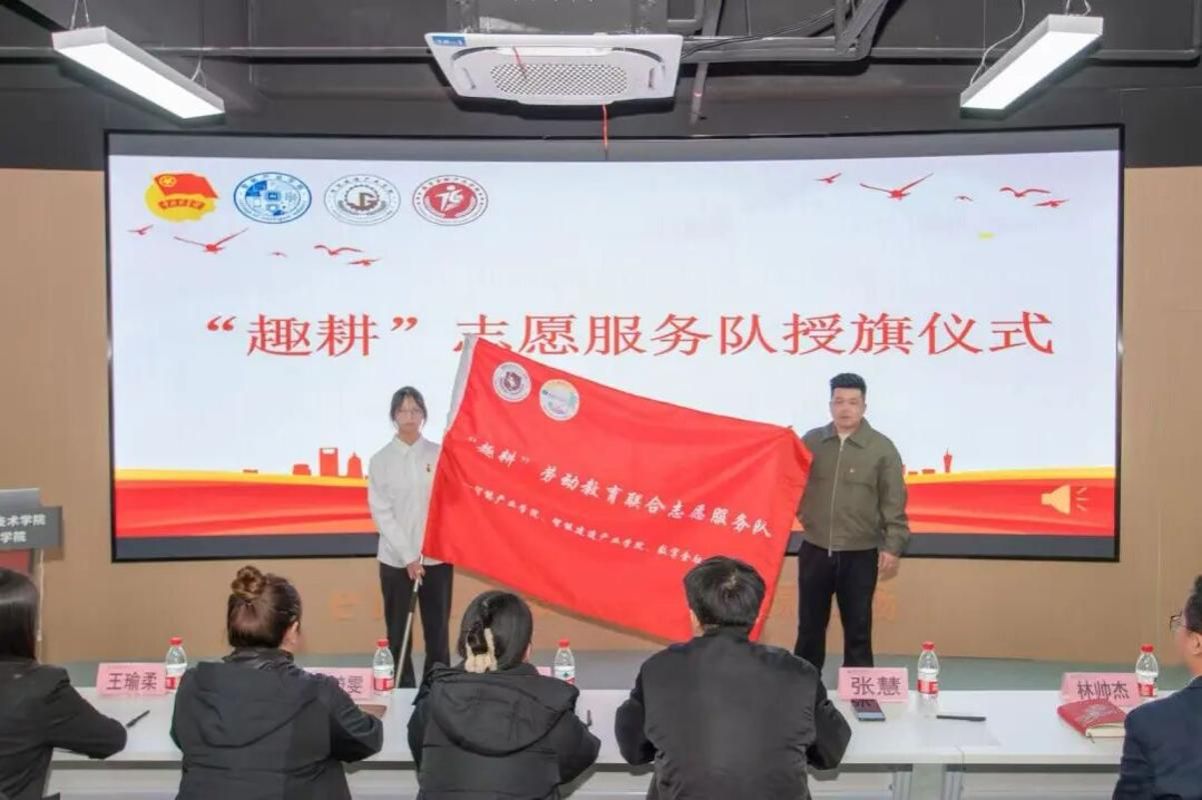 随后,智能建造产业学院党总支副书记张慧为 “趣耕” 劳动教育联合志愿服务队授旗,旗帜飘扬间,传递的是责任与使命。