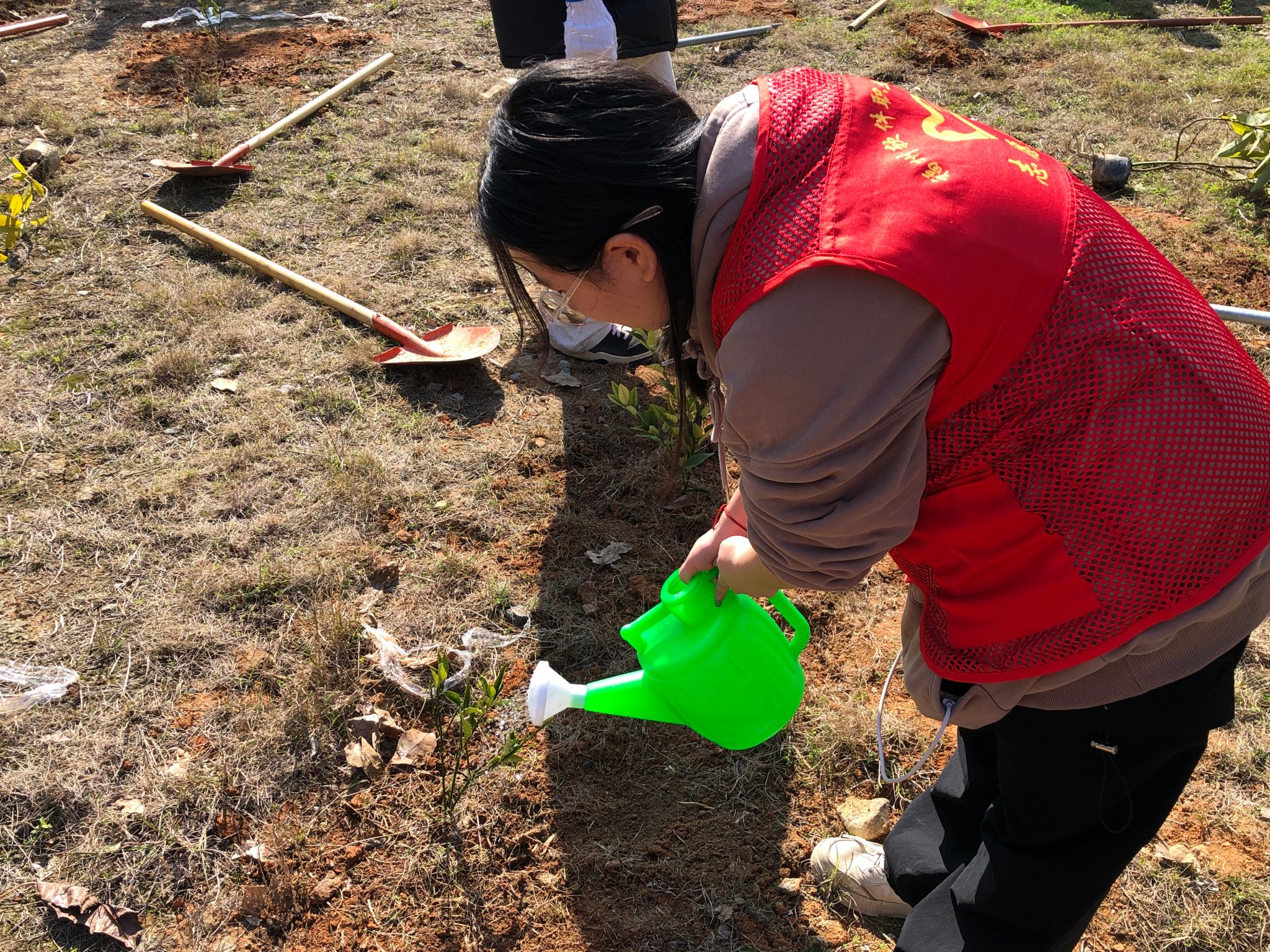 活动伊始,在负责人员的统筹安排下,同学们有序领取铁锹、水桶、树苗等物资,以小组为单位分工协作,奔赴指定种植区域。大家挽袖躬身、挥锹挖坑,小心翼翼地扶苗、填坑、踩实、培土,有条不紊地提水浇灌,每一个步骤都细致认真,用双手为大宏华侨广场种下片片新绿,让雷锋精神在植绿护绿的实践中落地生根。